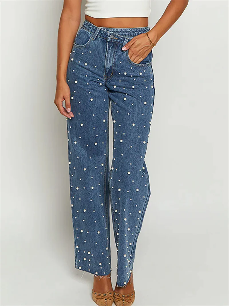 2025 Y2K Fashion Beading Vintage Denim Pants Women Loose Baggy Straight Jeans Female Casual Midi Waist Trousers Trend Streetwear