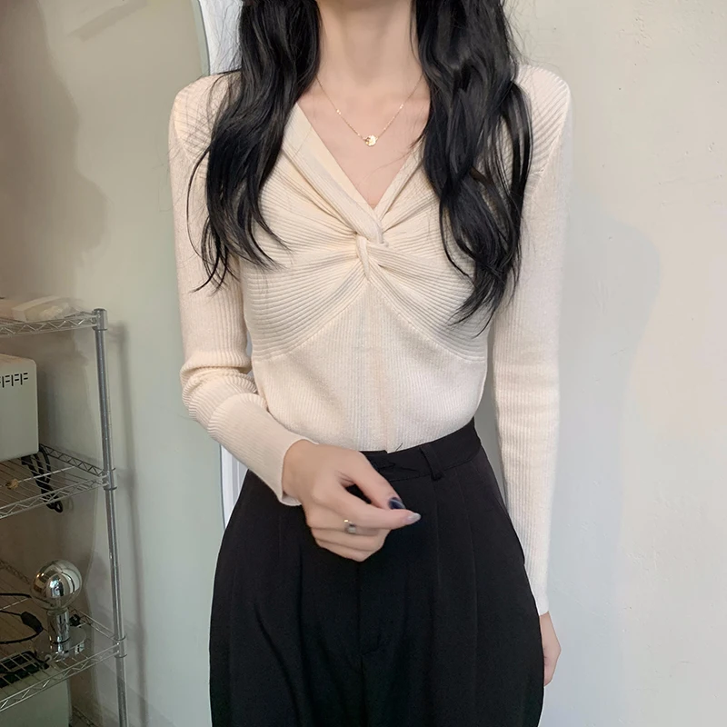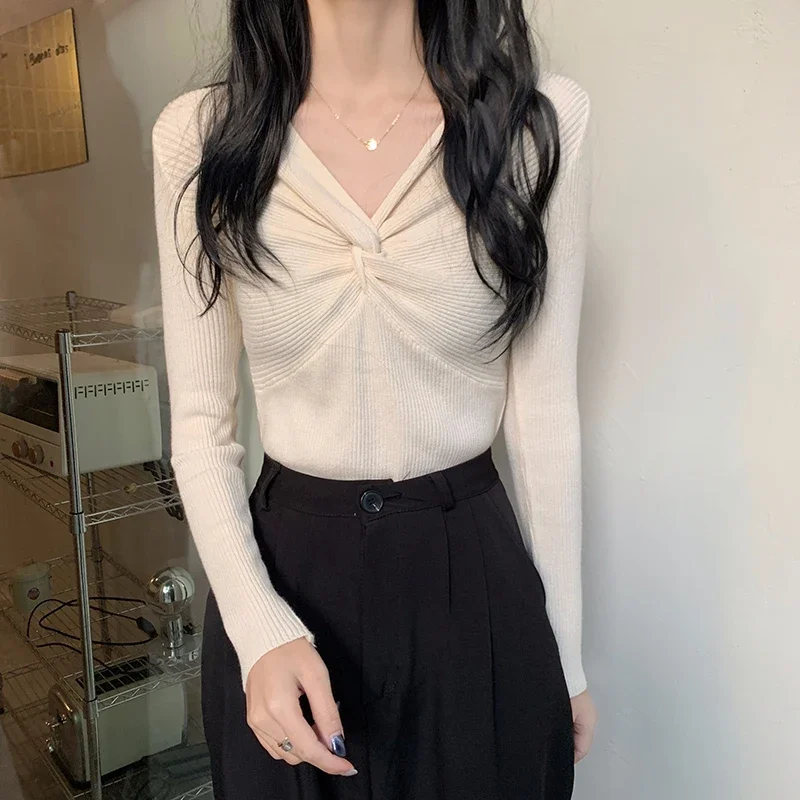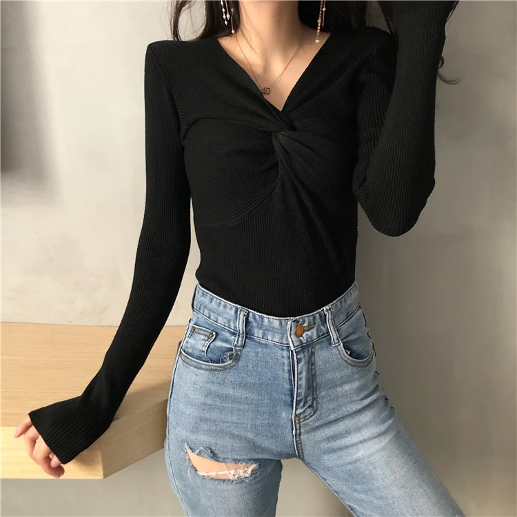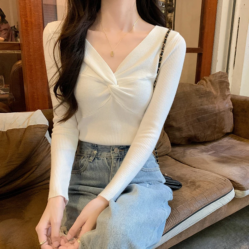 Autumn Winter Skinny Knitted Shirt Women Pullover Sweater Tops Female Long Sleeve Elastic V-neck Slim Sweaters Knit Shirts