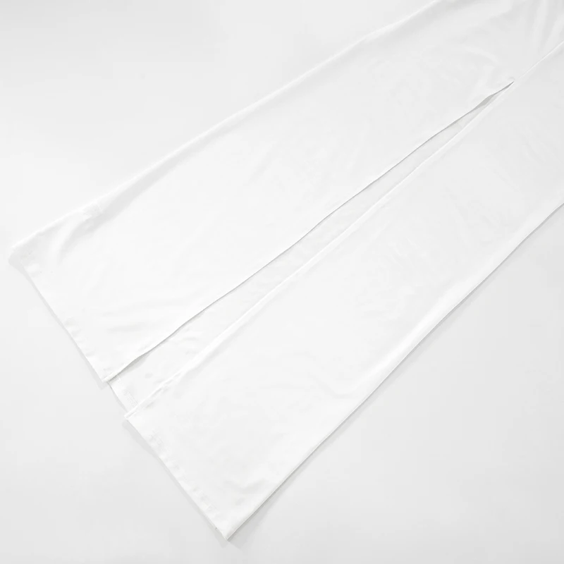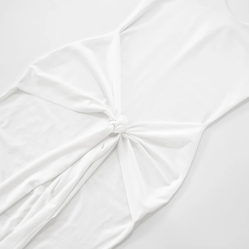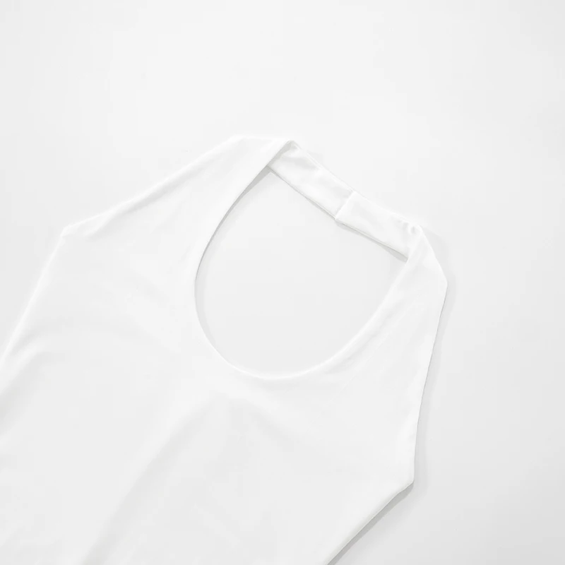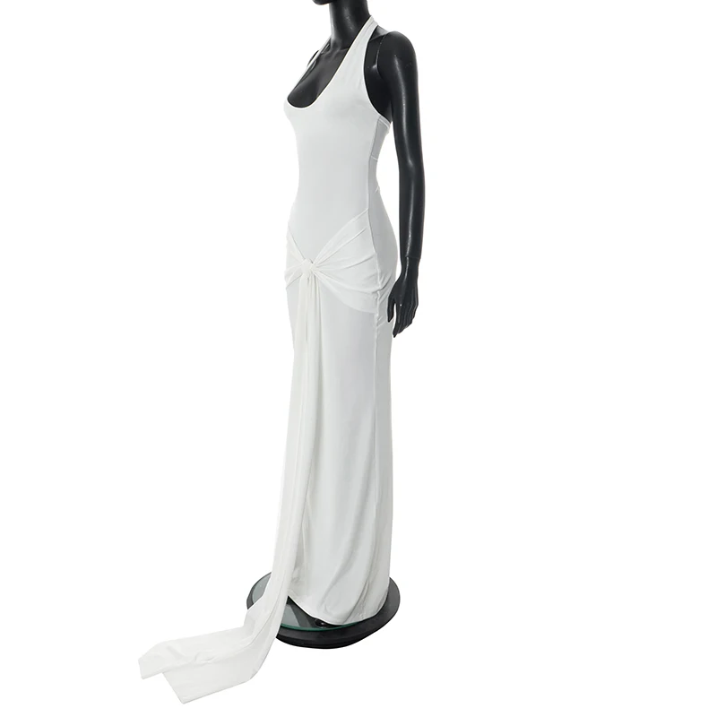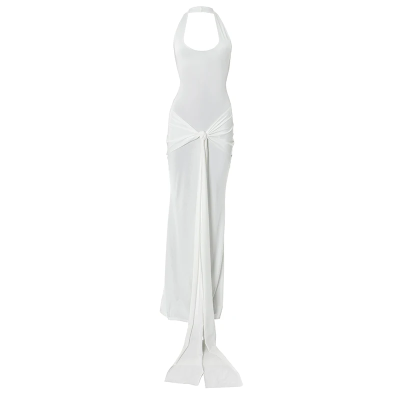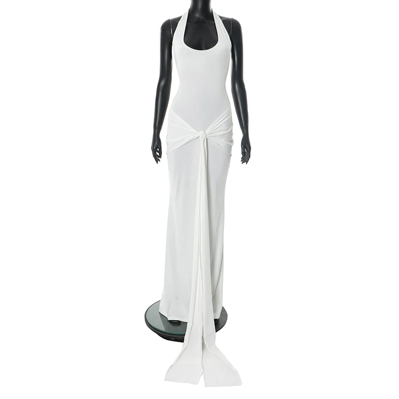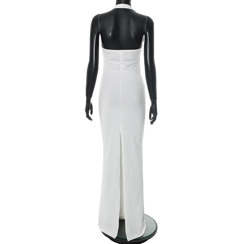 CUTENOVA Women Solid Color Sleeveless Hanging Neck Backless Shrinking Pleated Flutter Bandage Wrap Hip Split Floor Length Dress