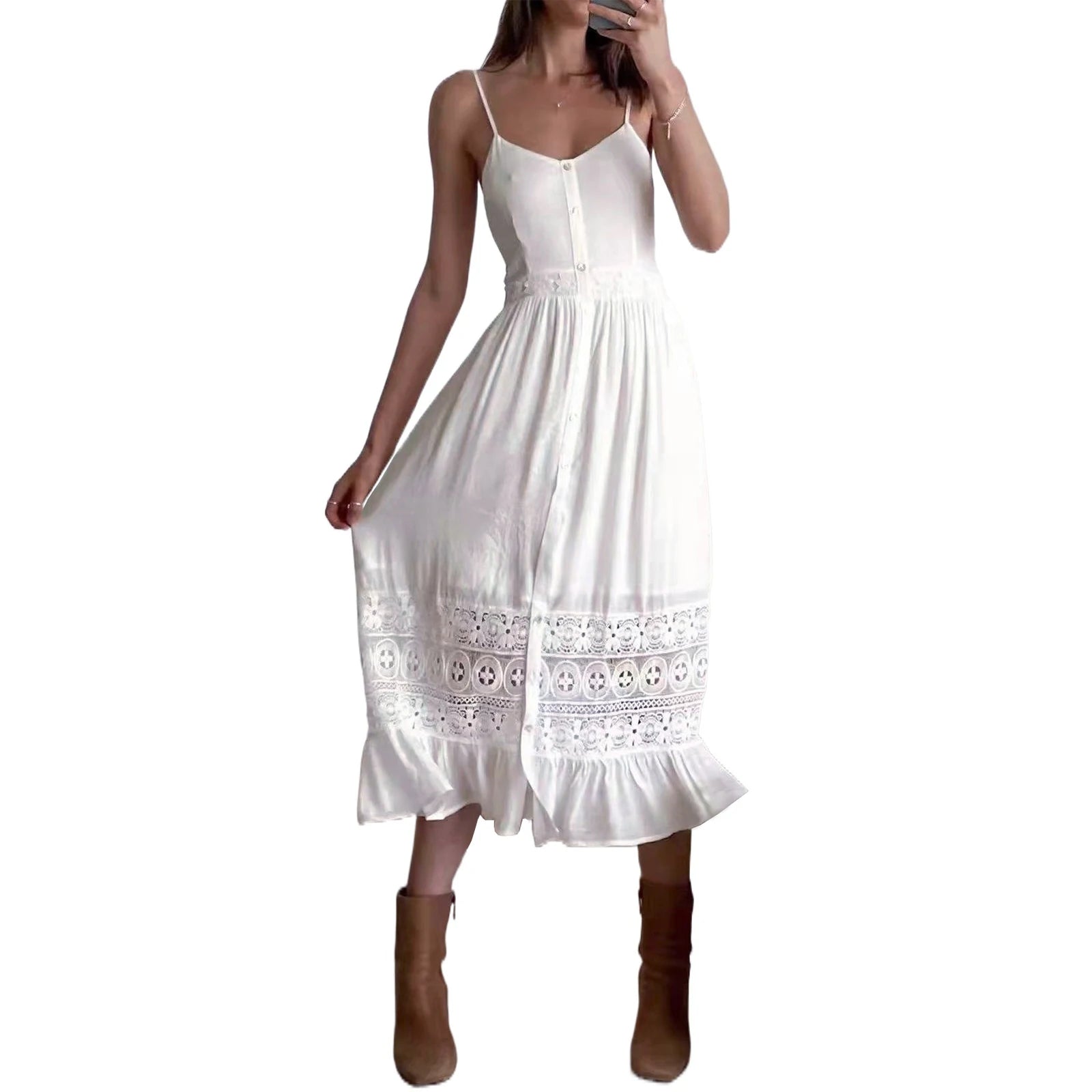 Women Sling Dress, Spaghetti Straps Button Closure Lace Patchwork Hollowed Summer Long Dress