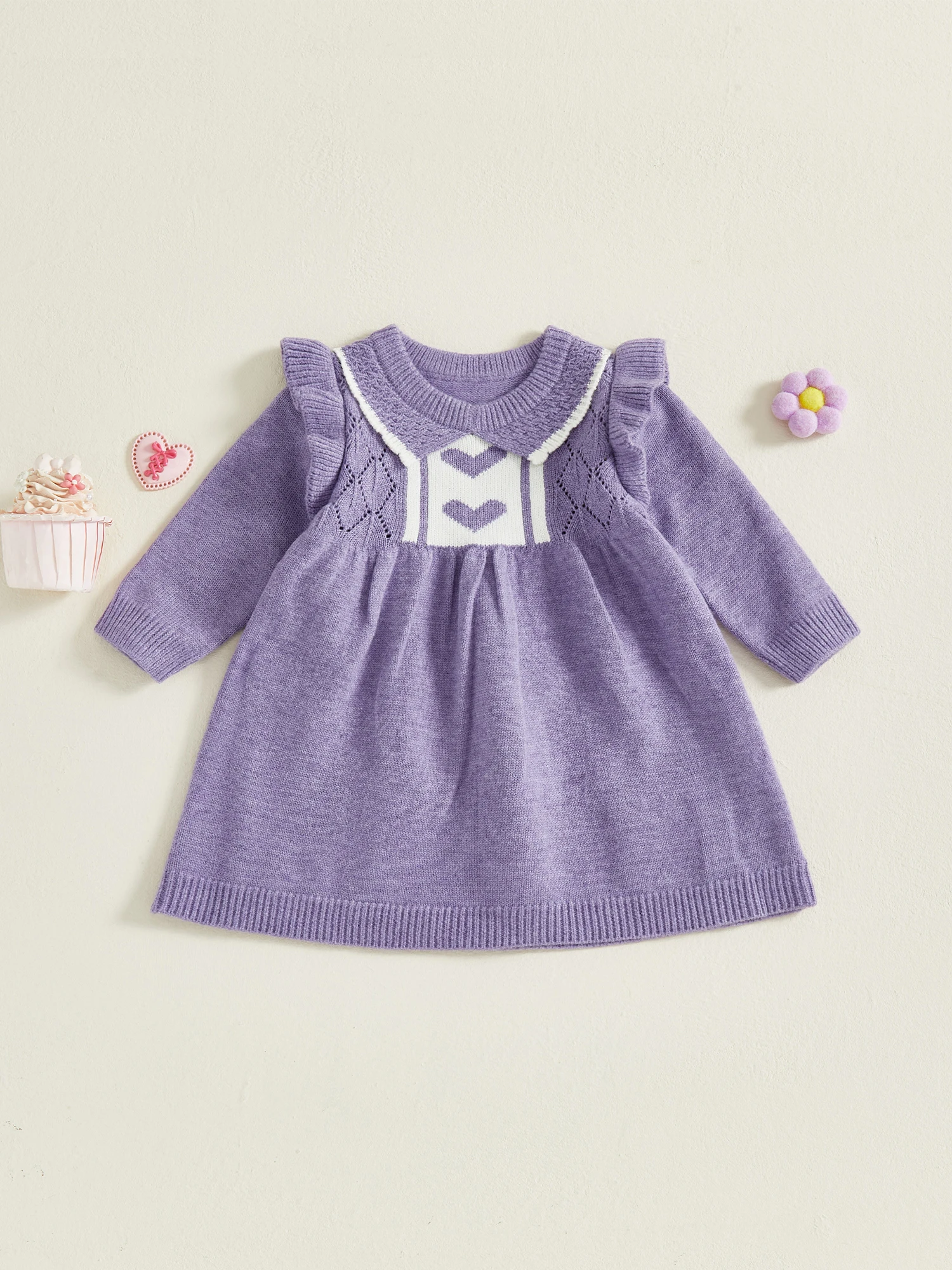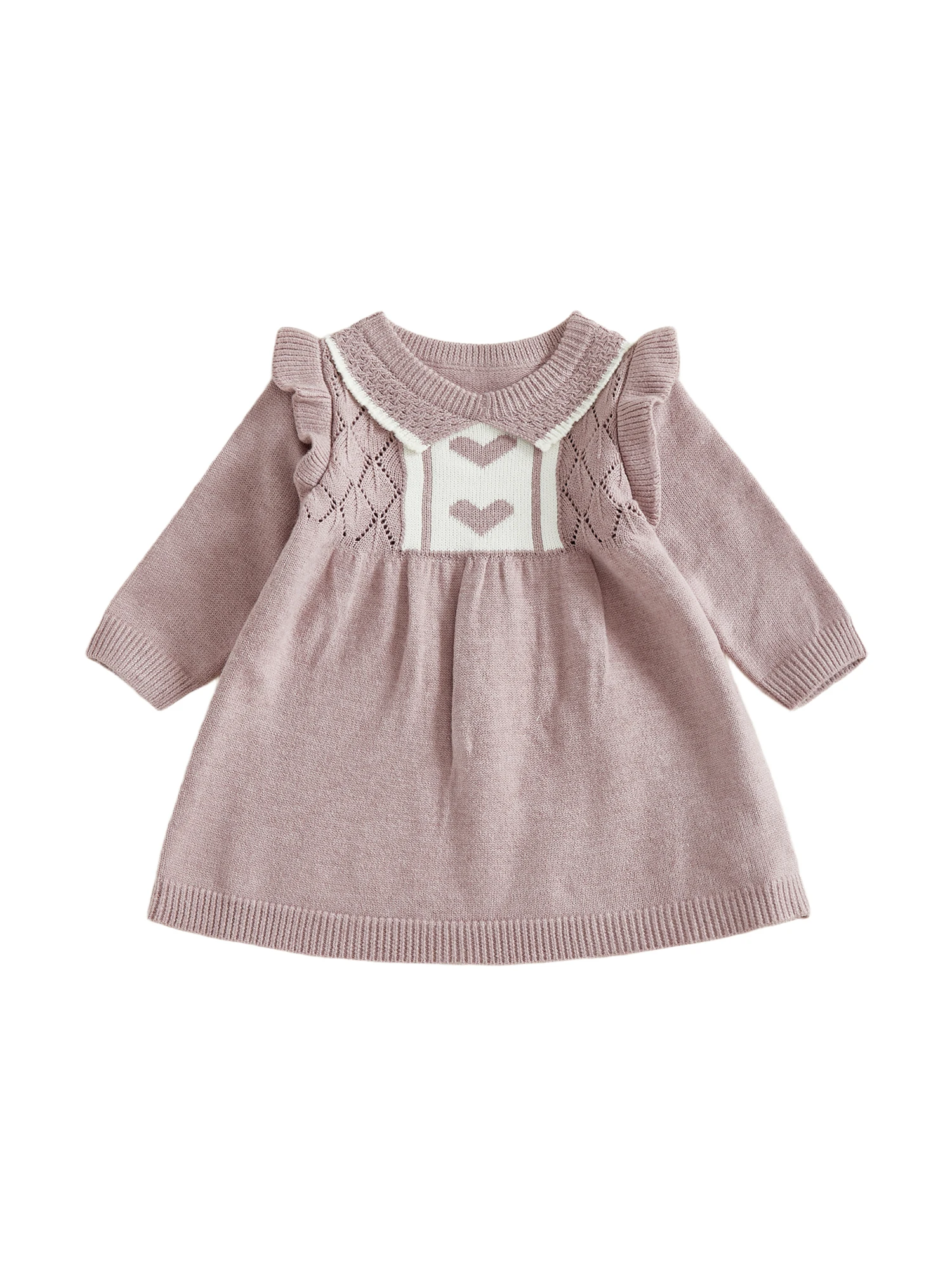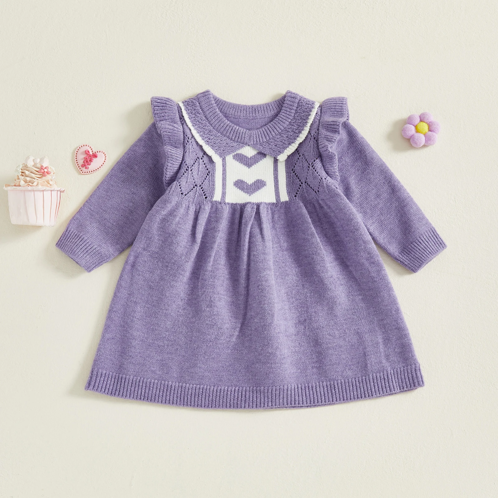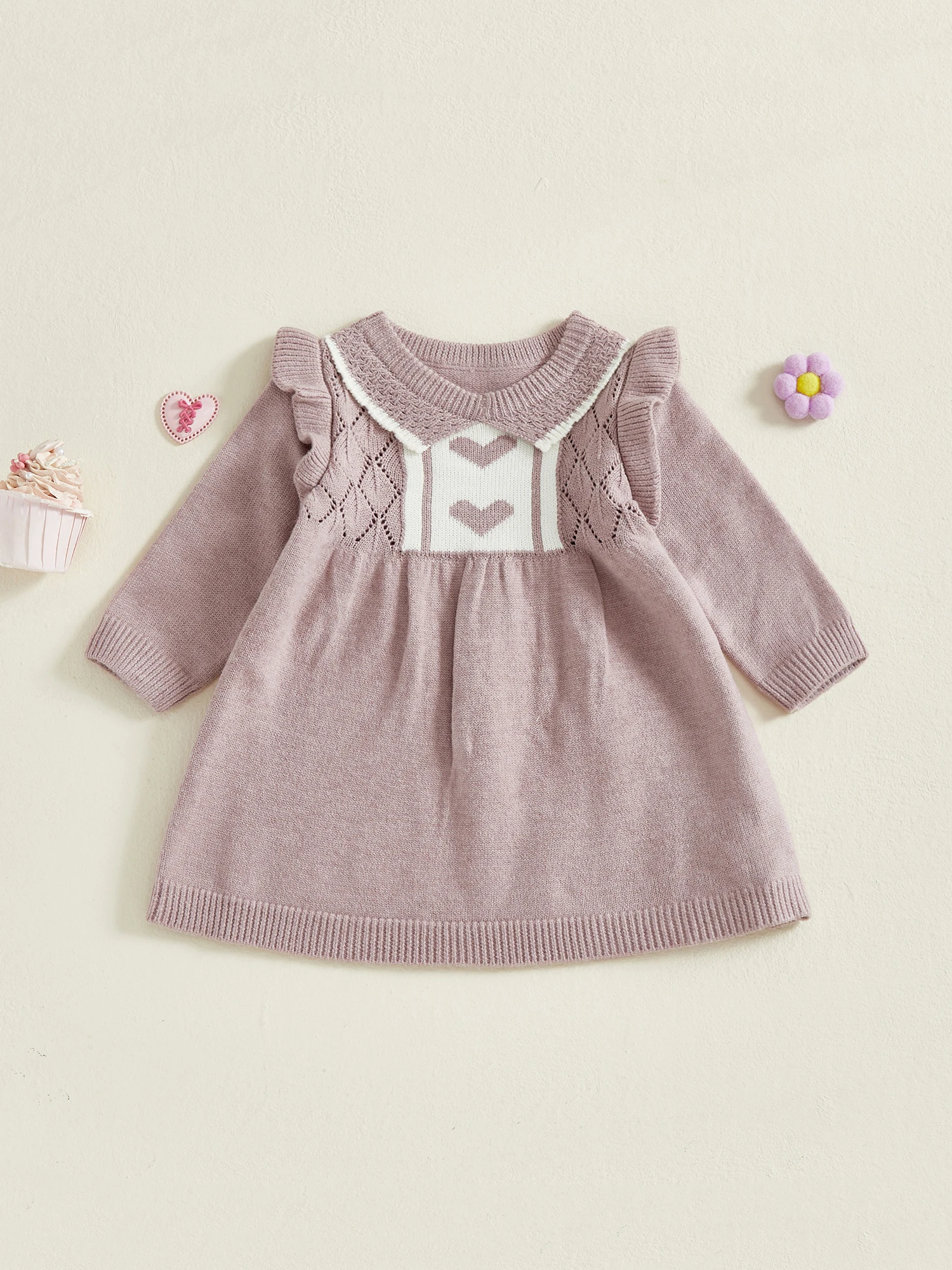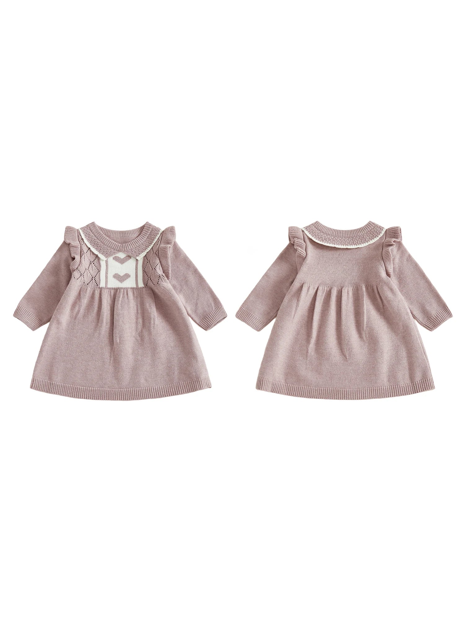 Little Girls Knit Sweater Dress Long Sleeve Round Neck Heart Print A-line Dress
