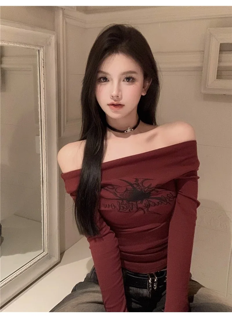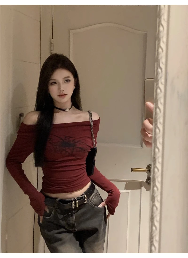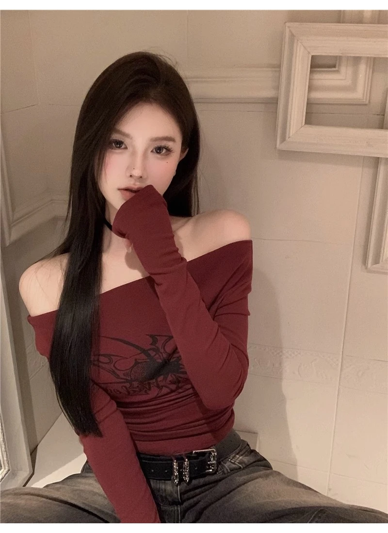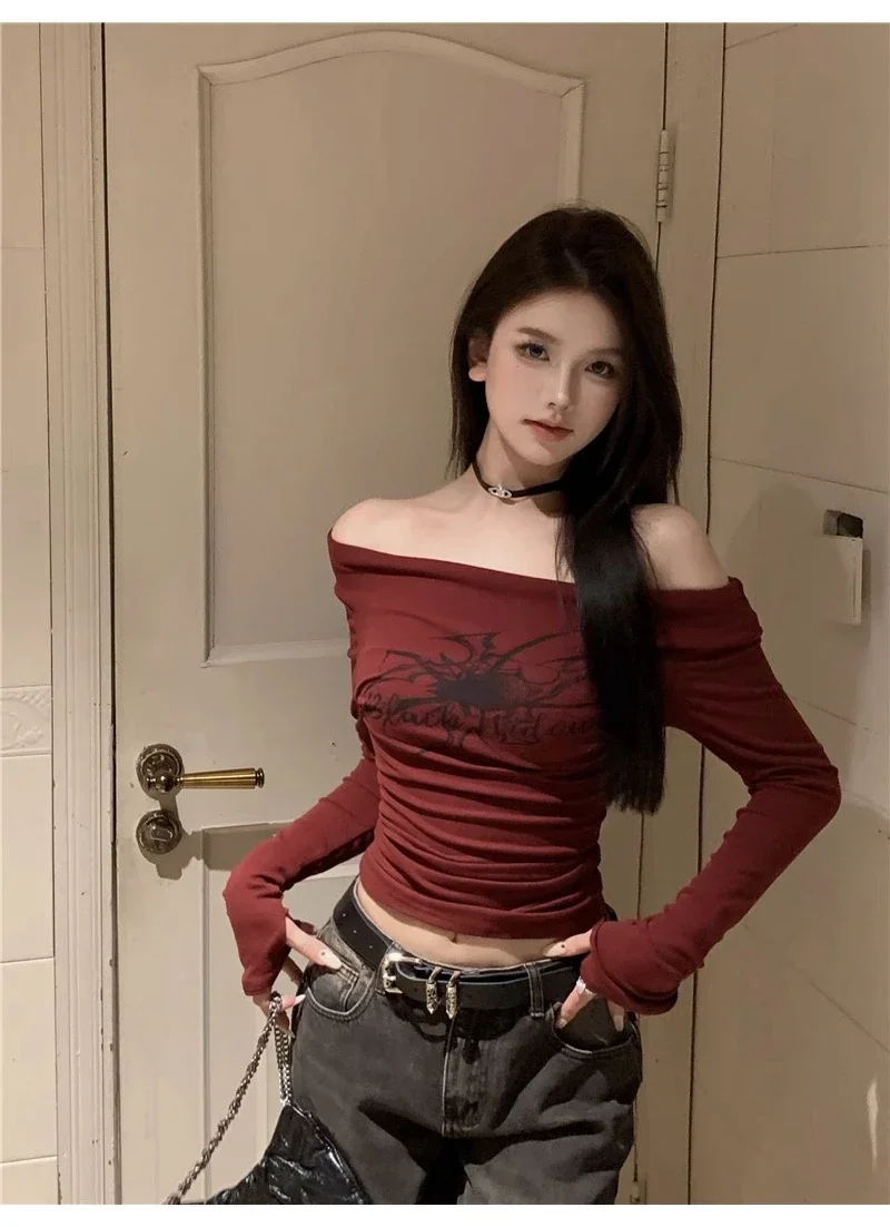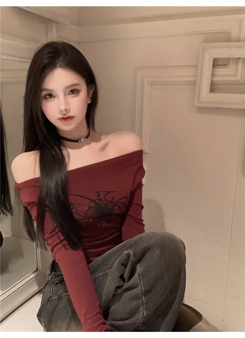 Gothic Print Grunge T Shirt Women Long Sleeve Off Shoulder Y2k Vintage Tops Streetwear Korean Style Crop Top Autumn Winter