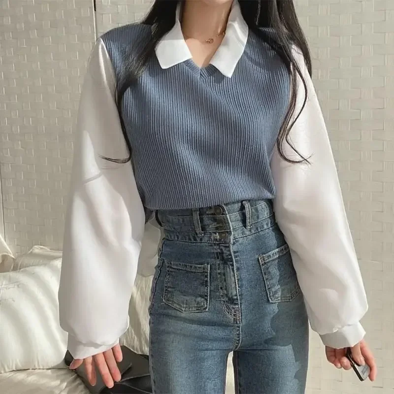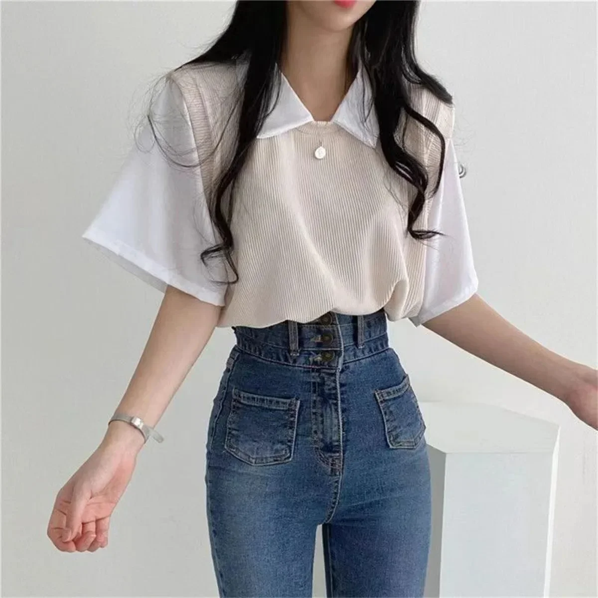 Summer Blouse Women Korean Style False Two-piece Polo Collar Blouses Y2k Tops Streetwear Loose Youth Pullovers Elegant Shirt