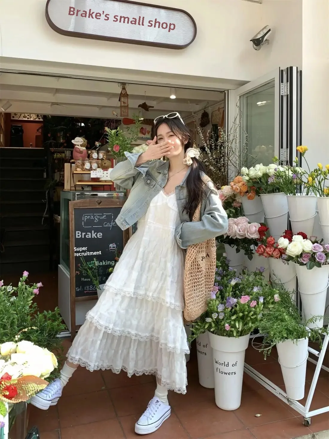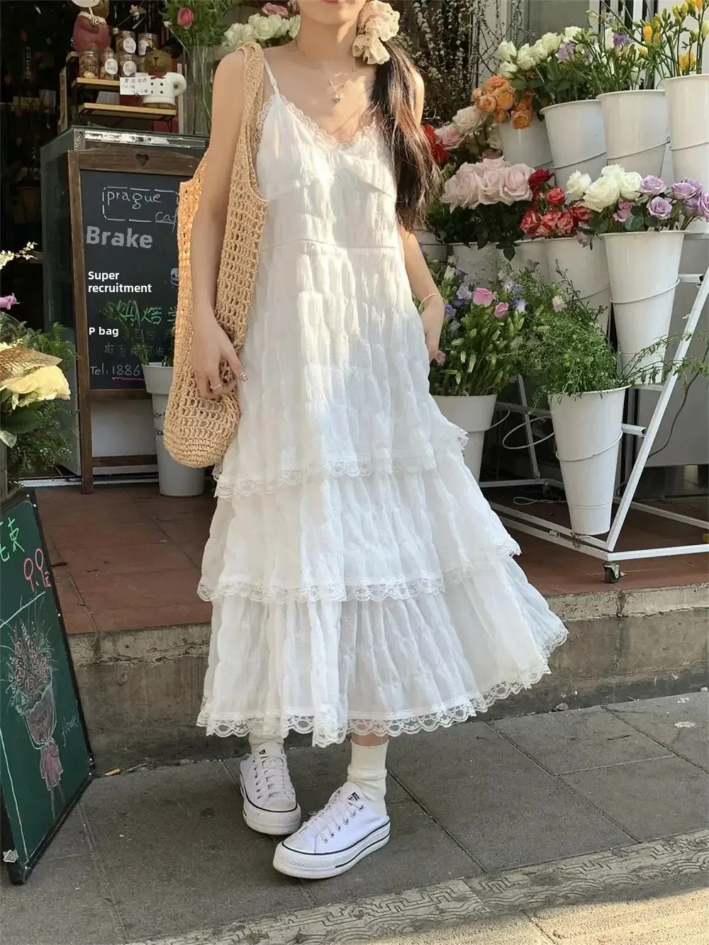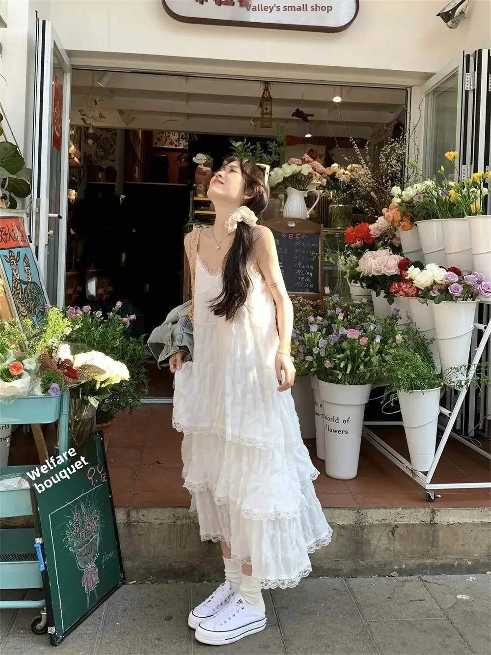 SweetAge-ReducingWhite French Style Tank Dress Loose Fit Long Dress For Women Spring Vacation Style Petite Cake Dress