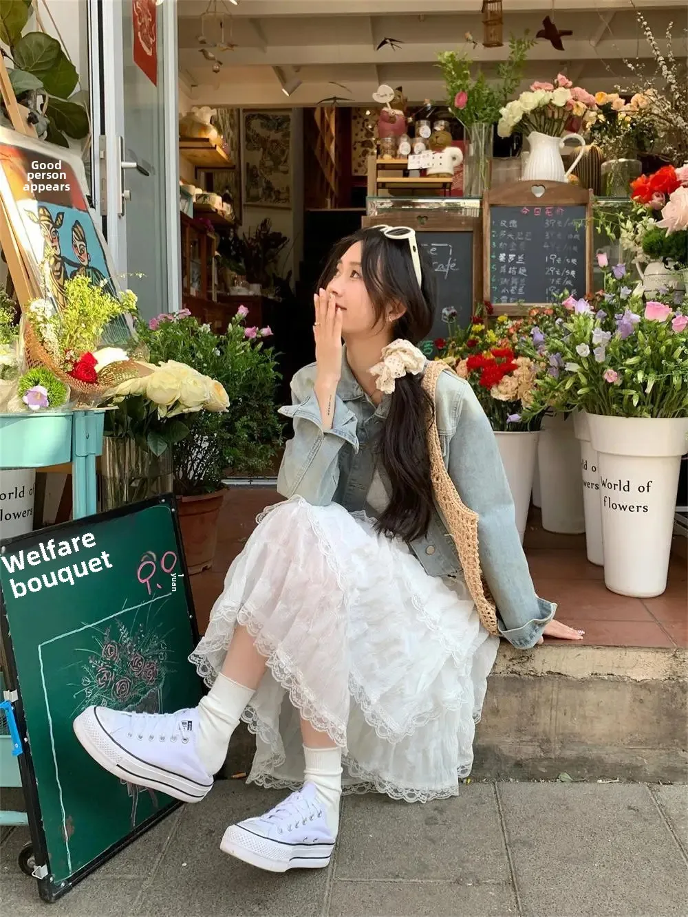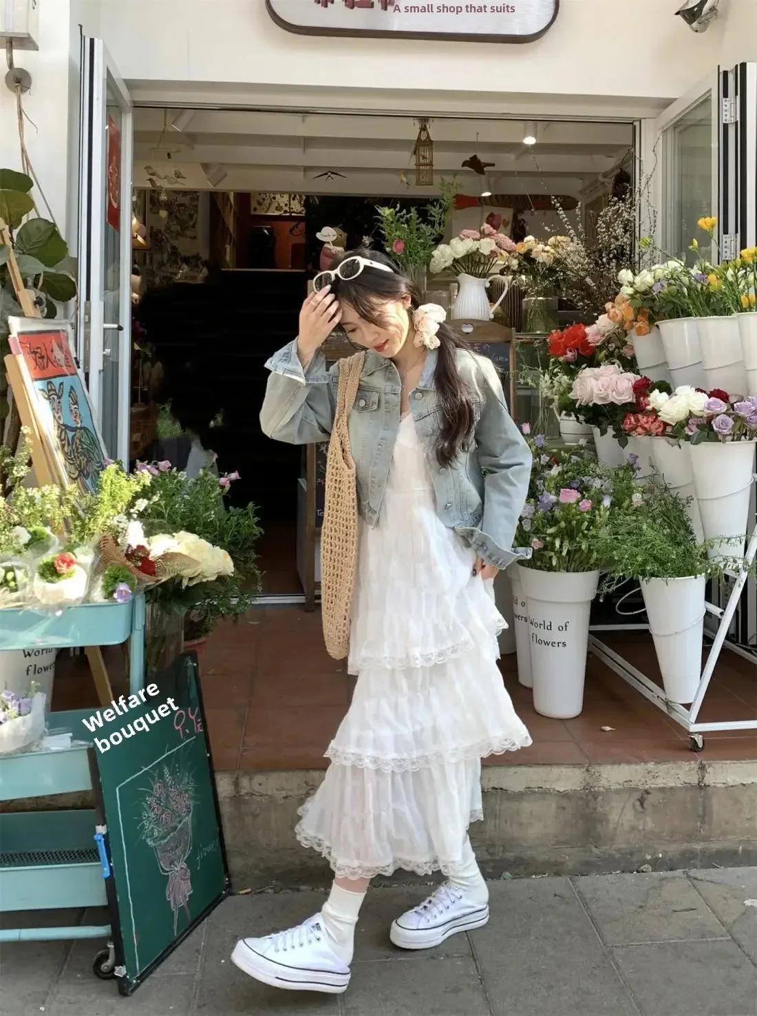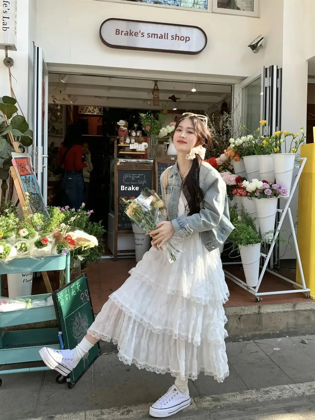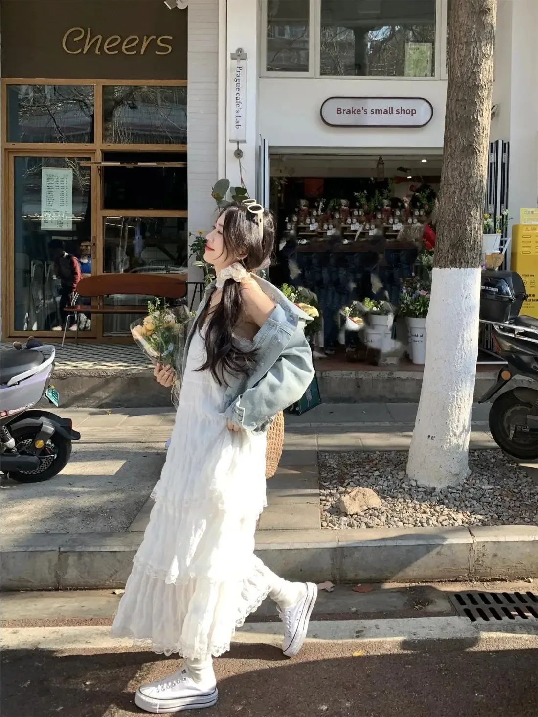 SweetAge-ReducingWhite French Style Tank Dress Loose Fit Long Dress For Women Spring Vacation Style Petite Cake Dress