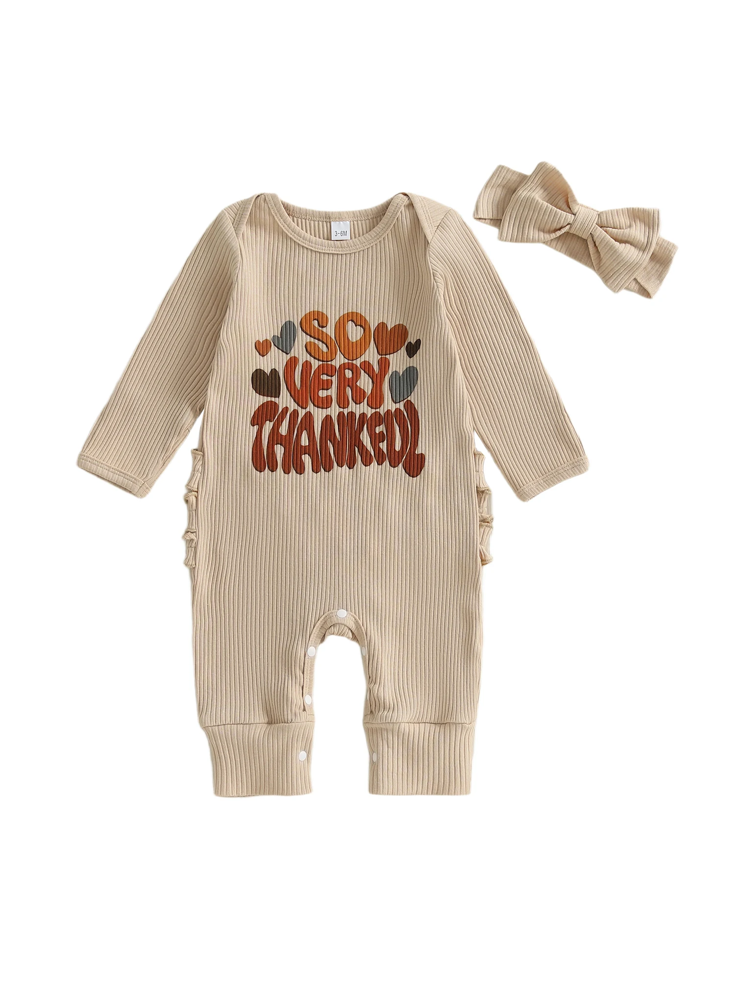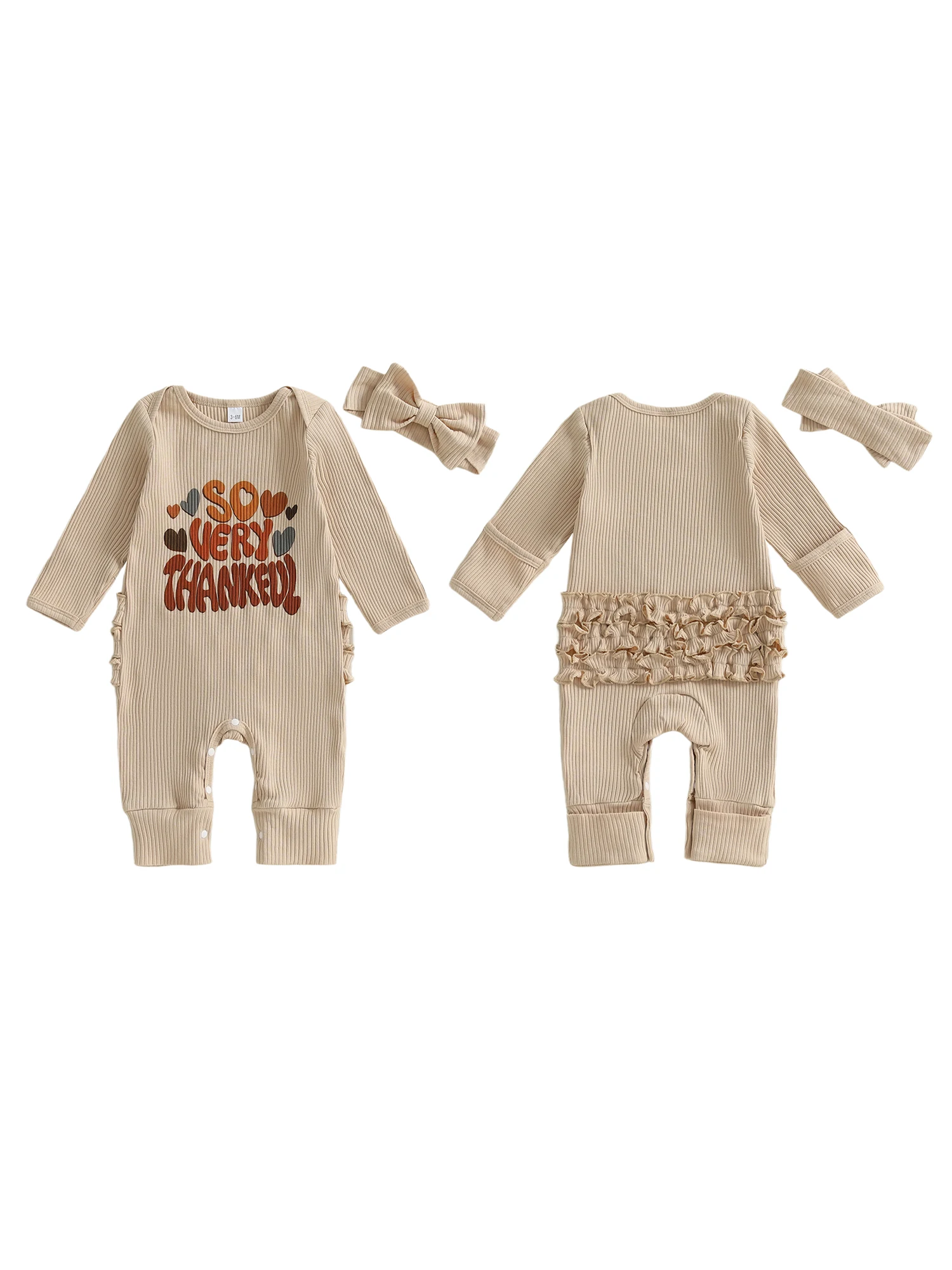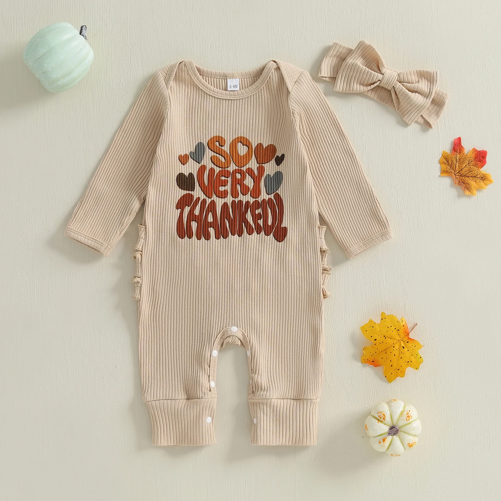 Thanksgiving Baby Girl Romper Long Sleeve O Neck Letter Turkey Print Jumpsuit with Matching Headband Set for Fall Holiday