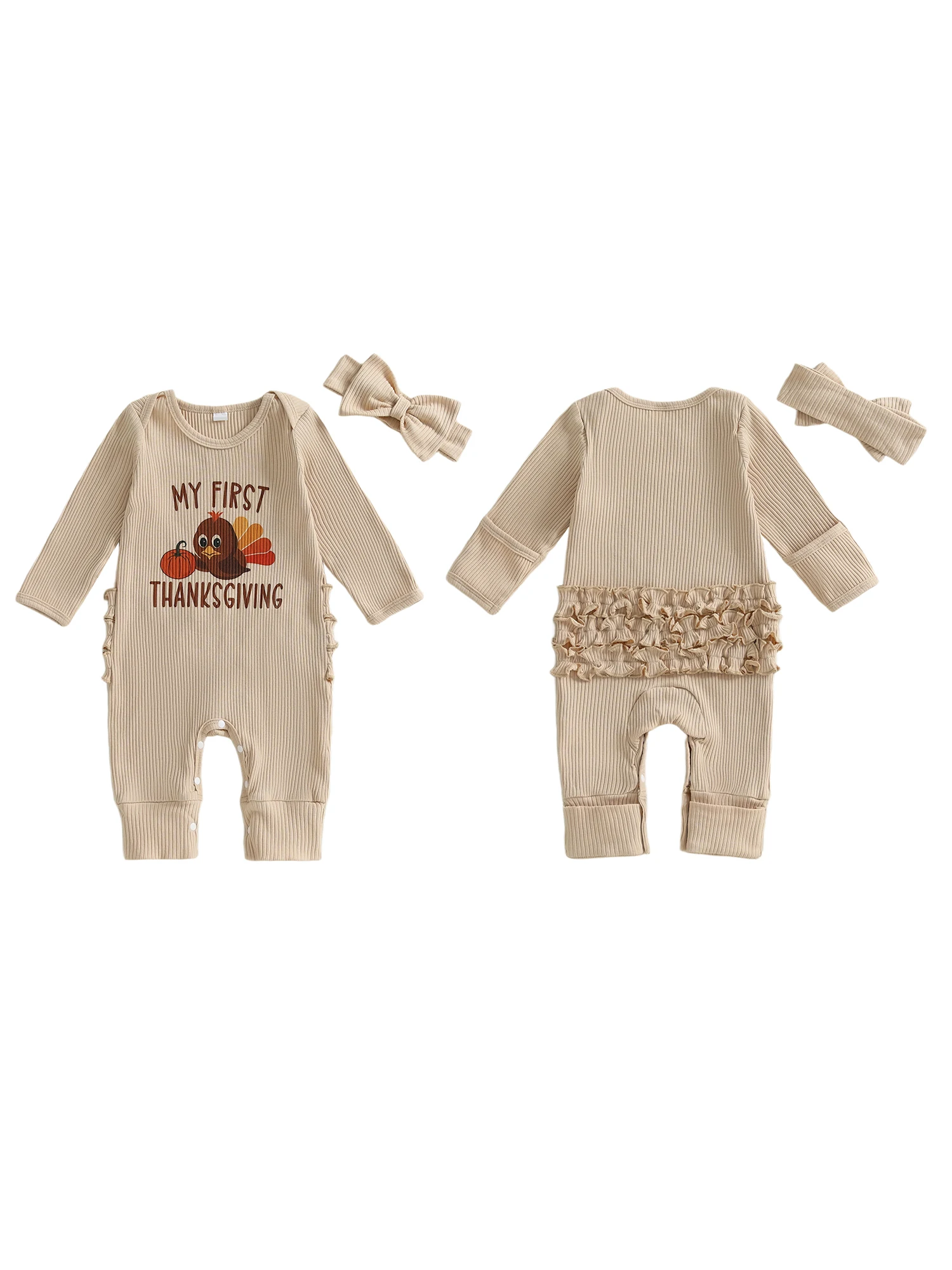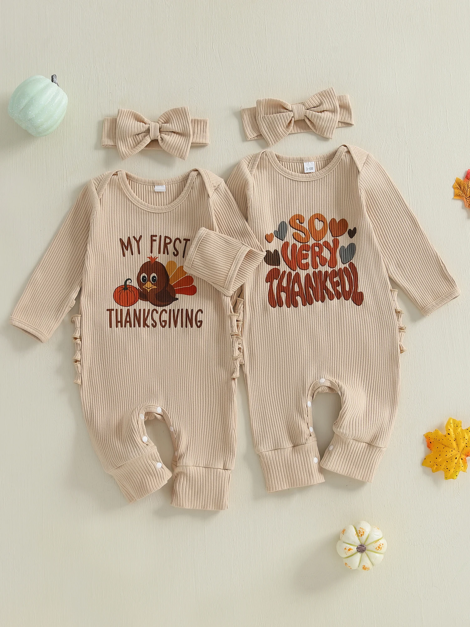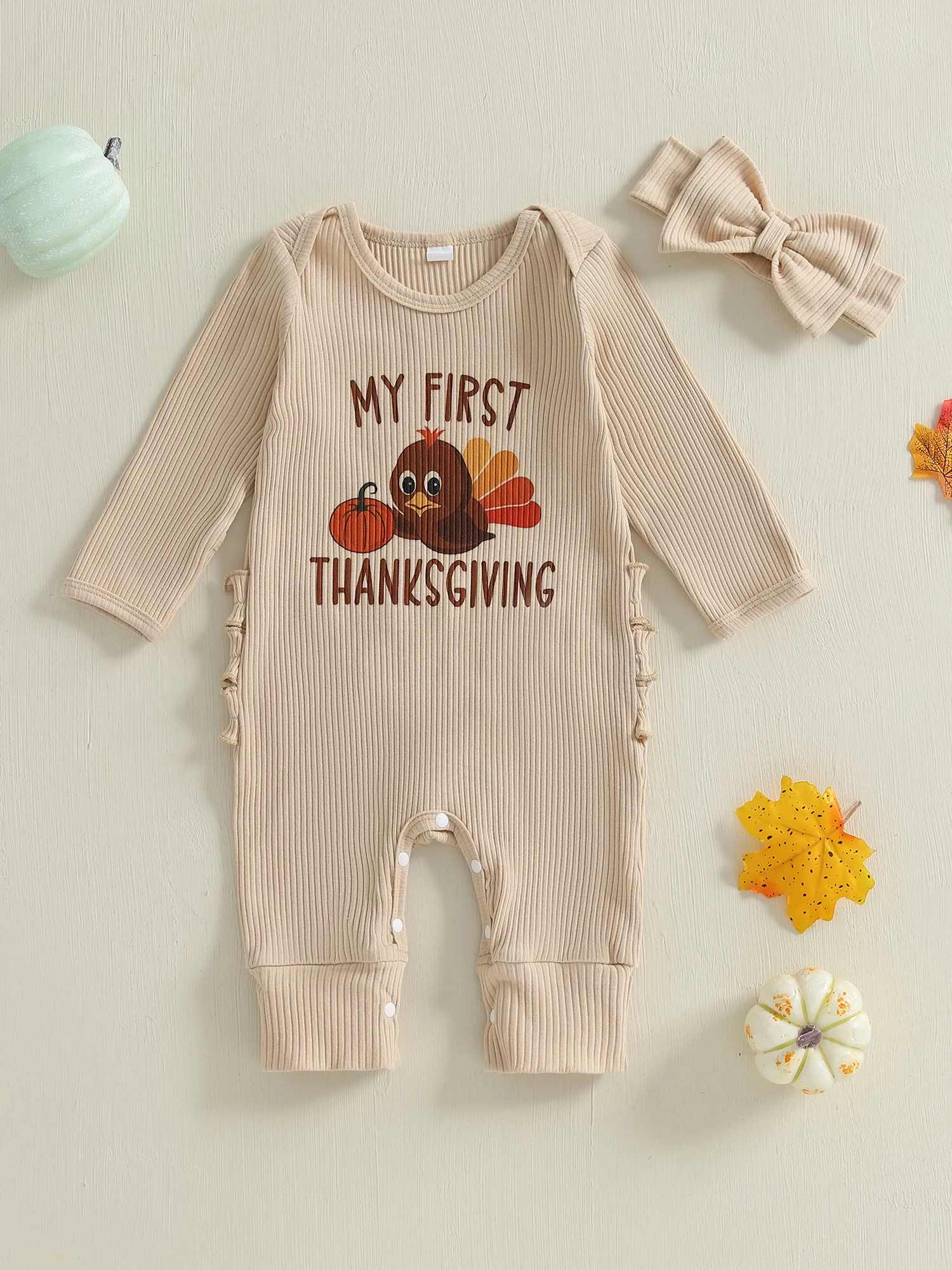 Baby Girl Thanksgiving Jumpsuit Long Sleeve O Neck Letter/Turkey Print Romper with Headband