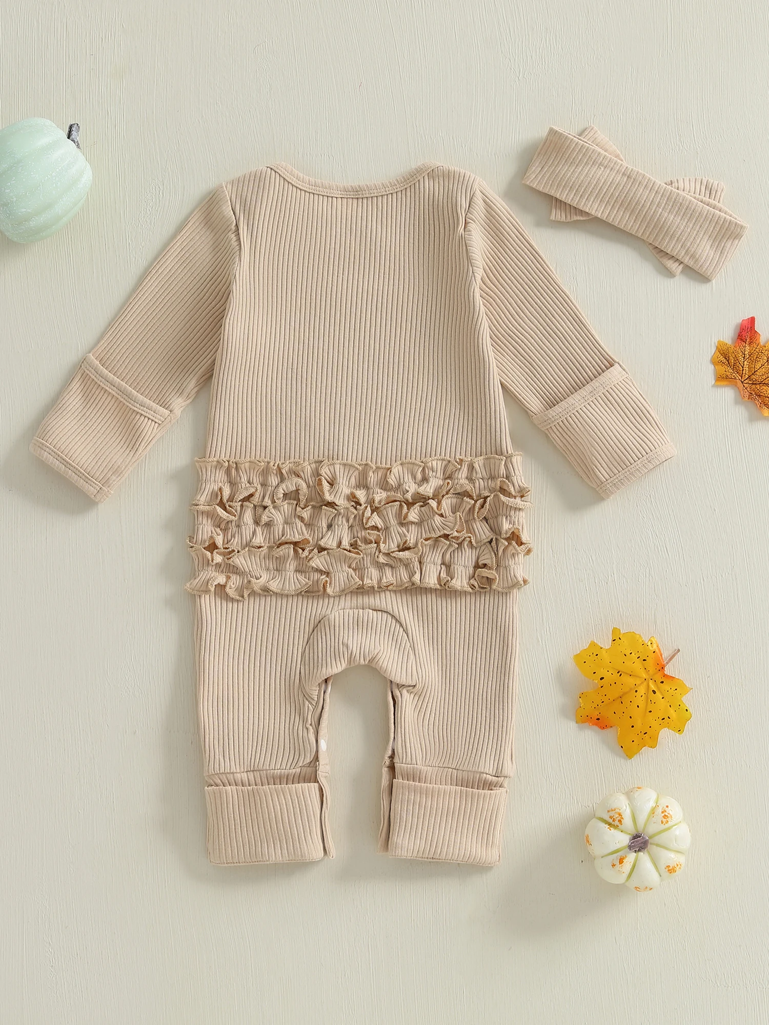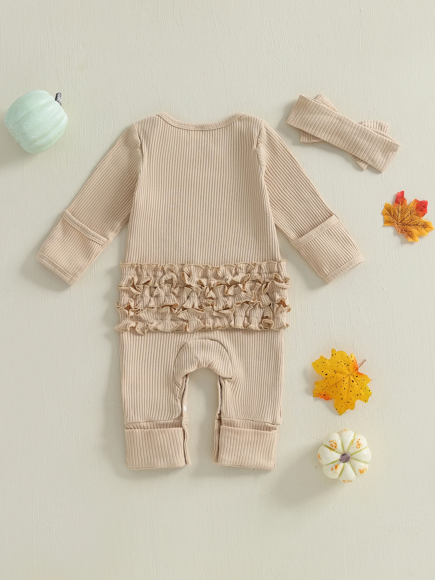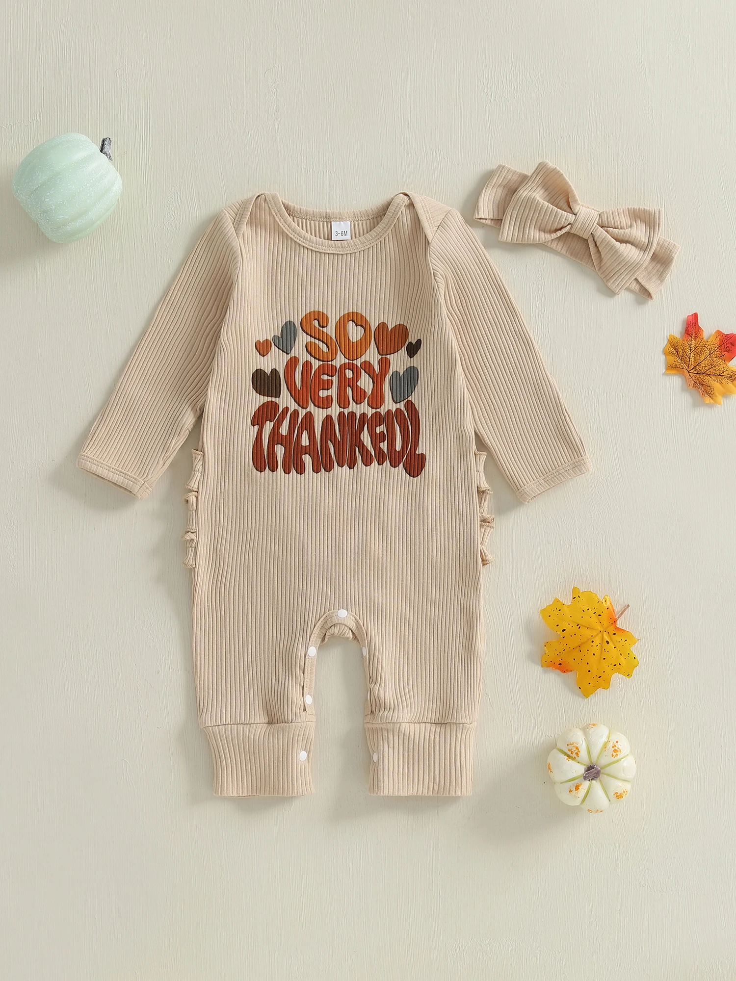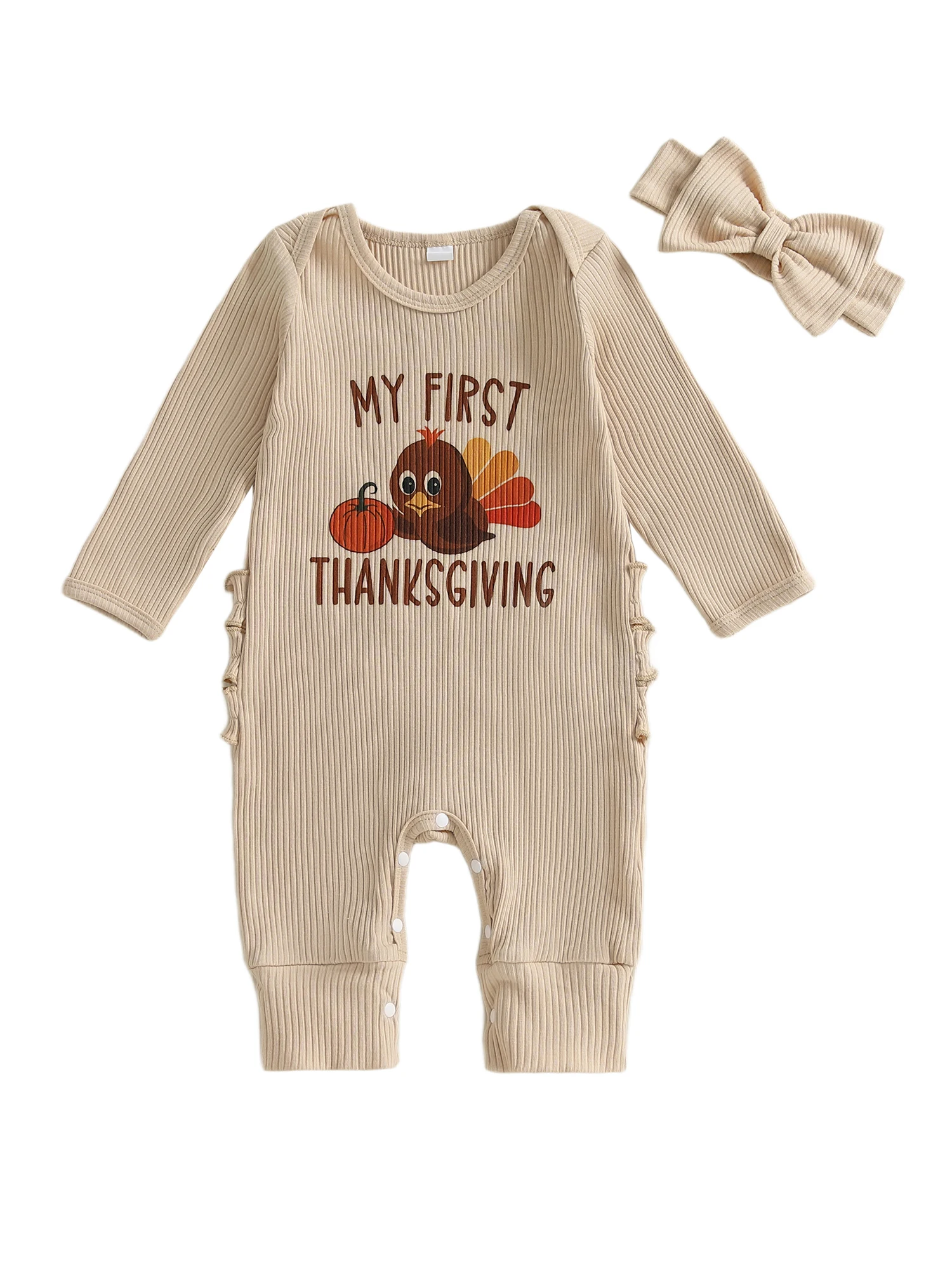 Baby Girl Thanksgiving Jumpsuit Long Sleeve O Neck Letter/Turkey Print Romper with Headband