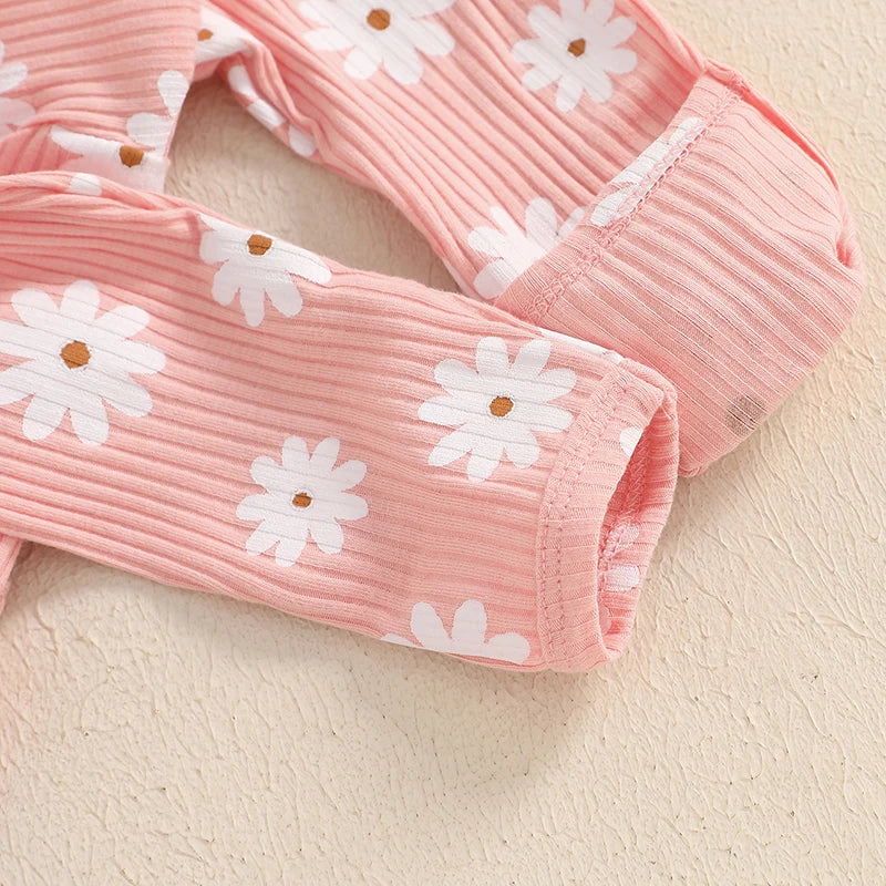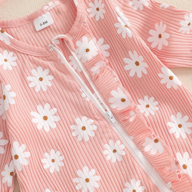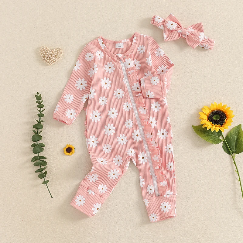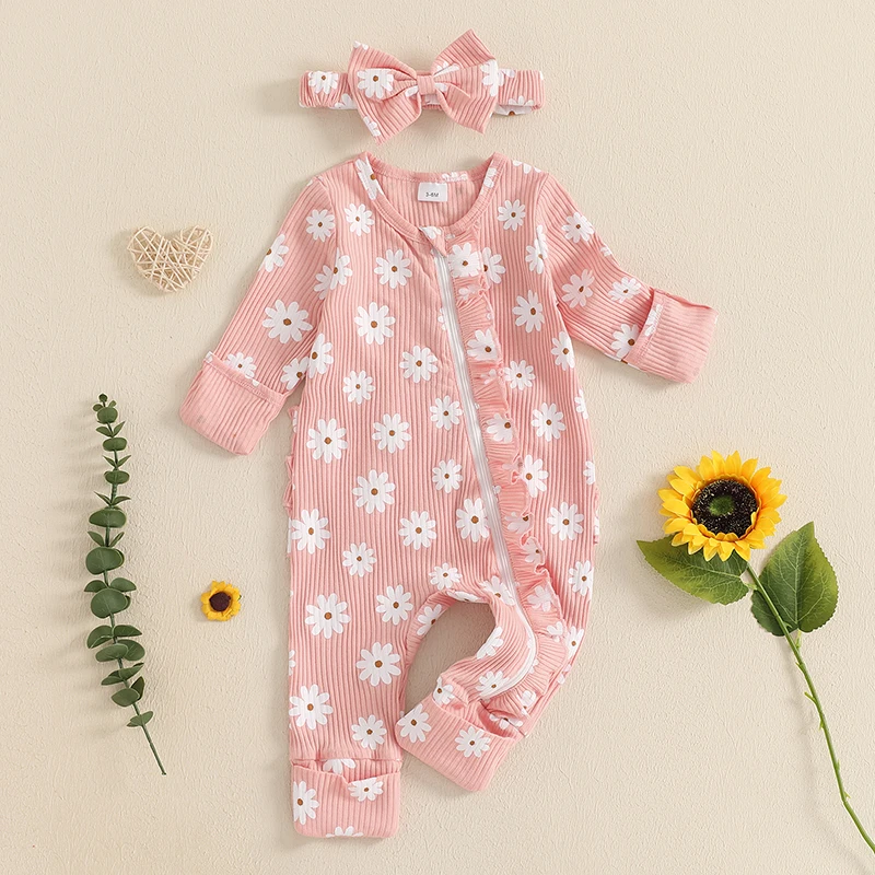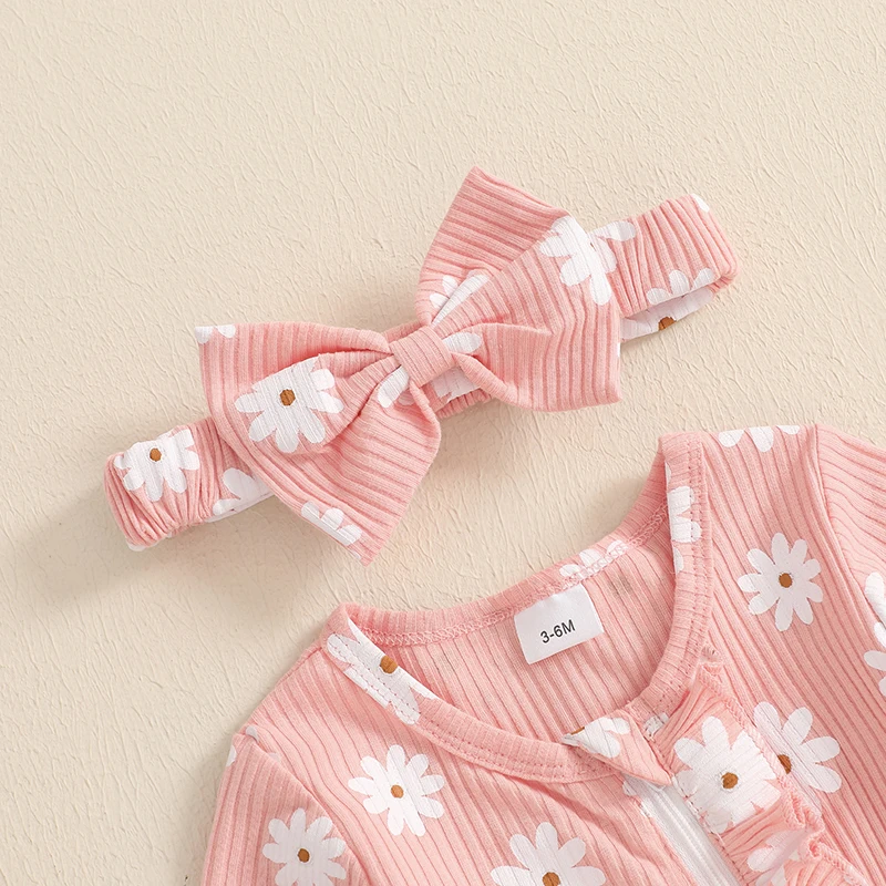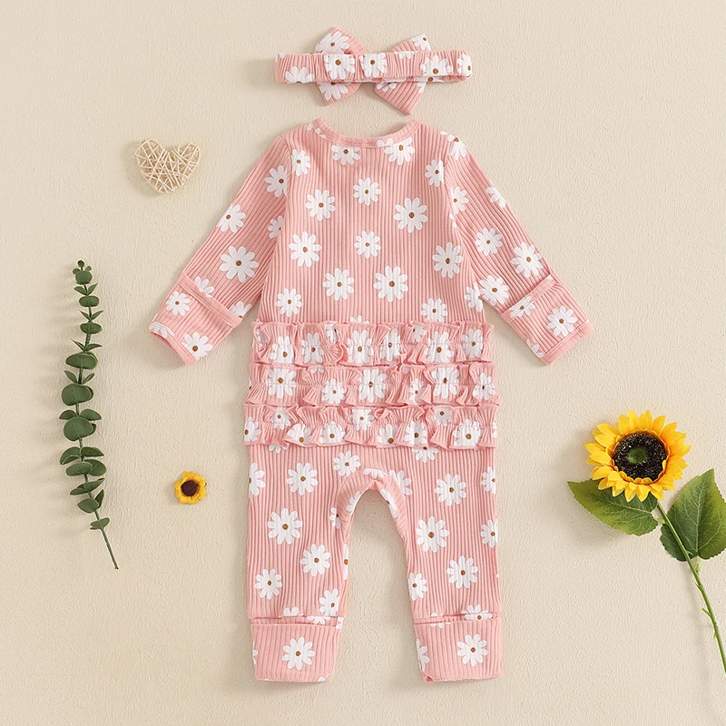 Baby Girl 2Pcs Fall Outfits Long Sleeve Floral Print Ruffle Jumpsuit with Headband Set Newborn Clothes