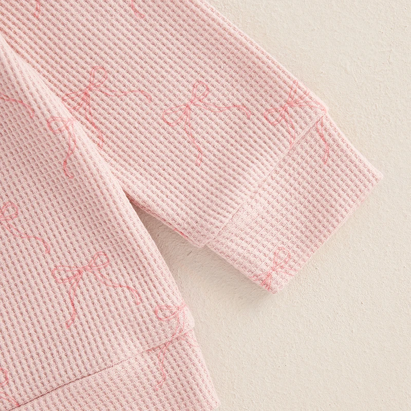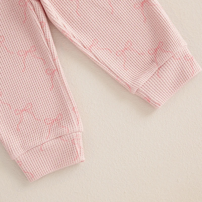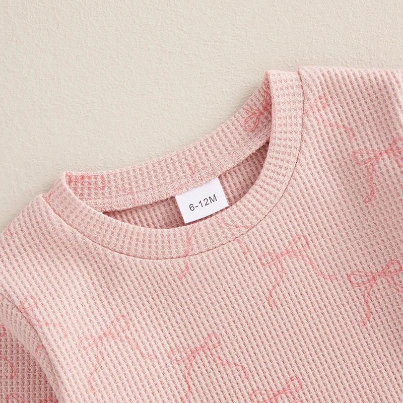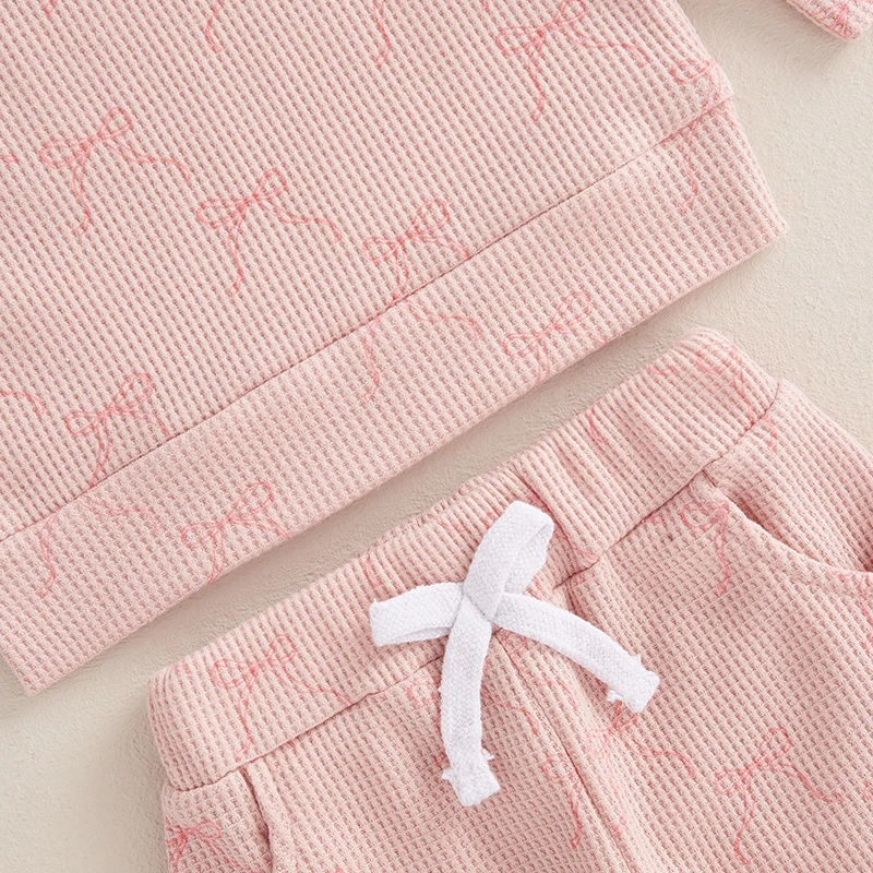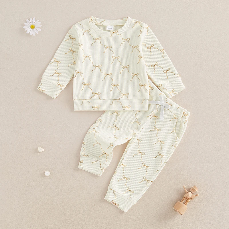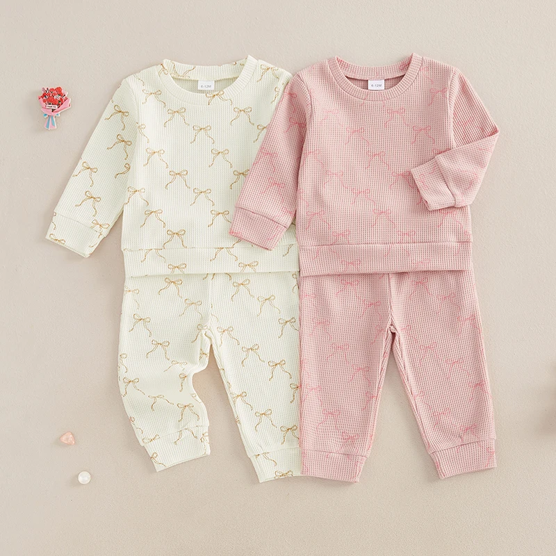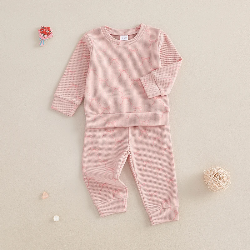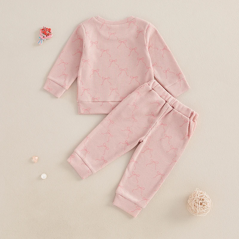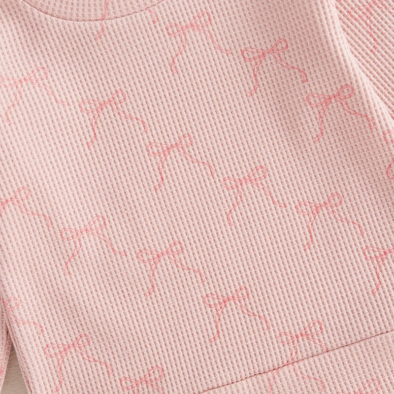 Baby Girl Waffle Outfit, Bow Print Long Sleeve Pullover Sweatshirt Elastic Waist Pants with Pockets 2 Piece Set