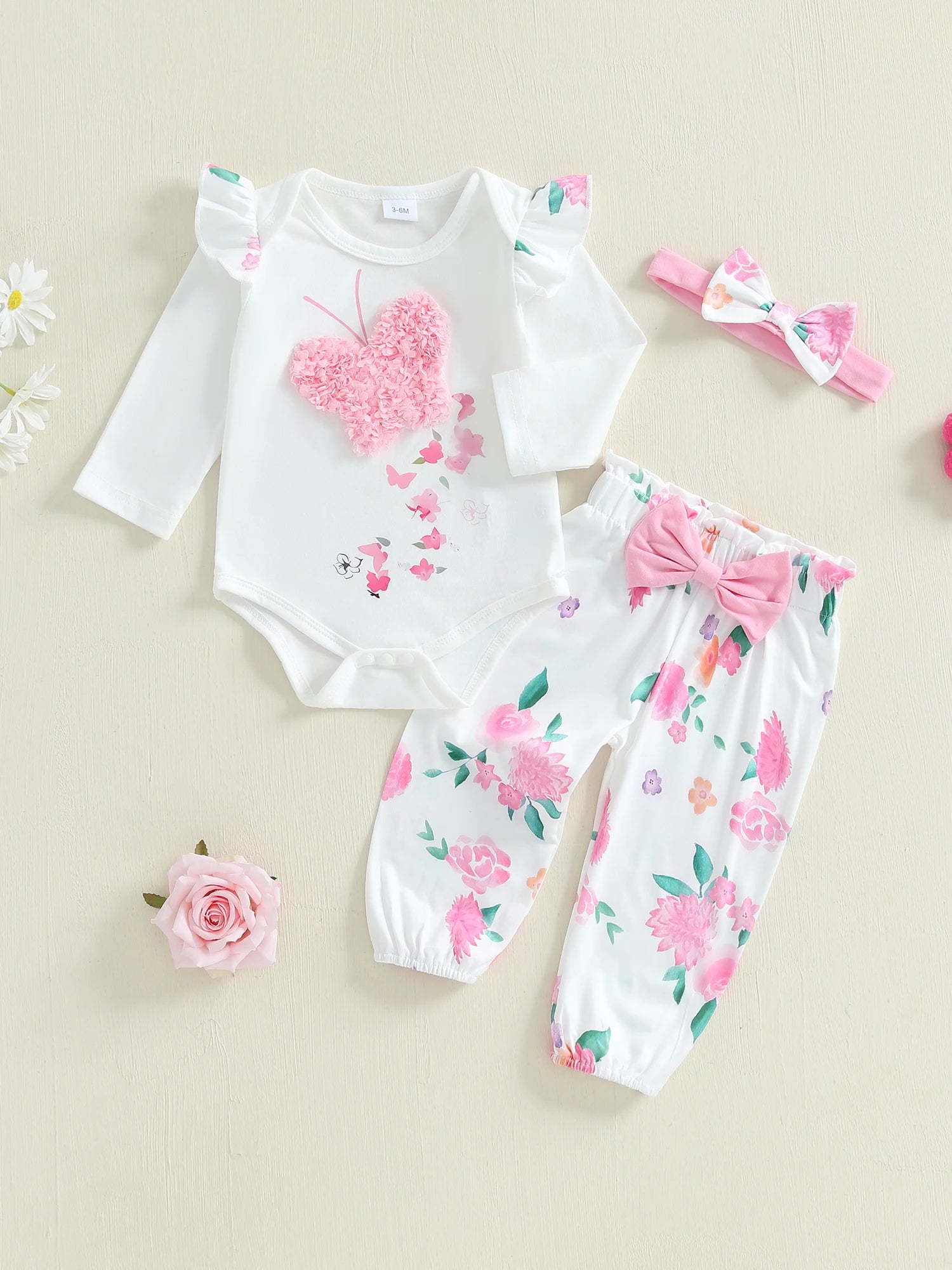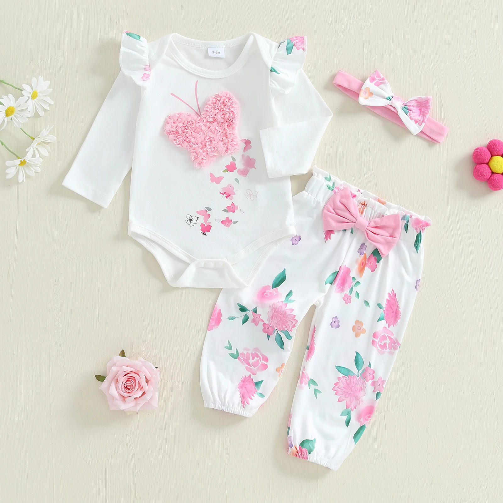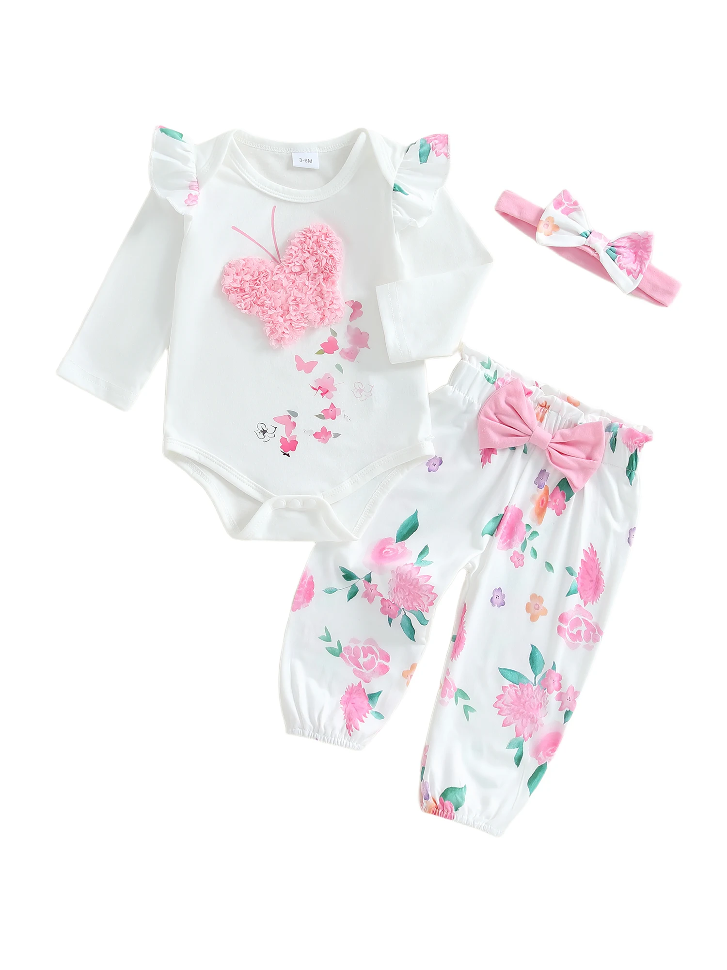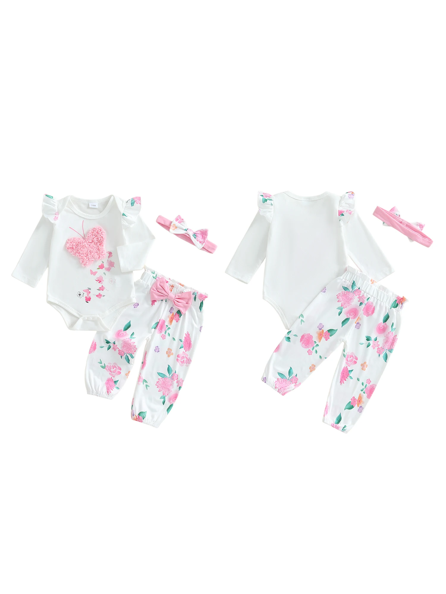 Baby Girls Fall Outfit, Long Sleeve Butterfly Print Romper with Floral Pants and Bowknot Headband Clothing Set