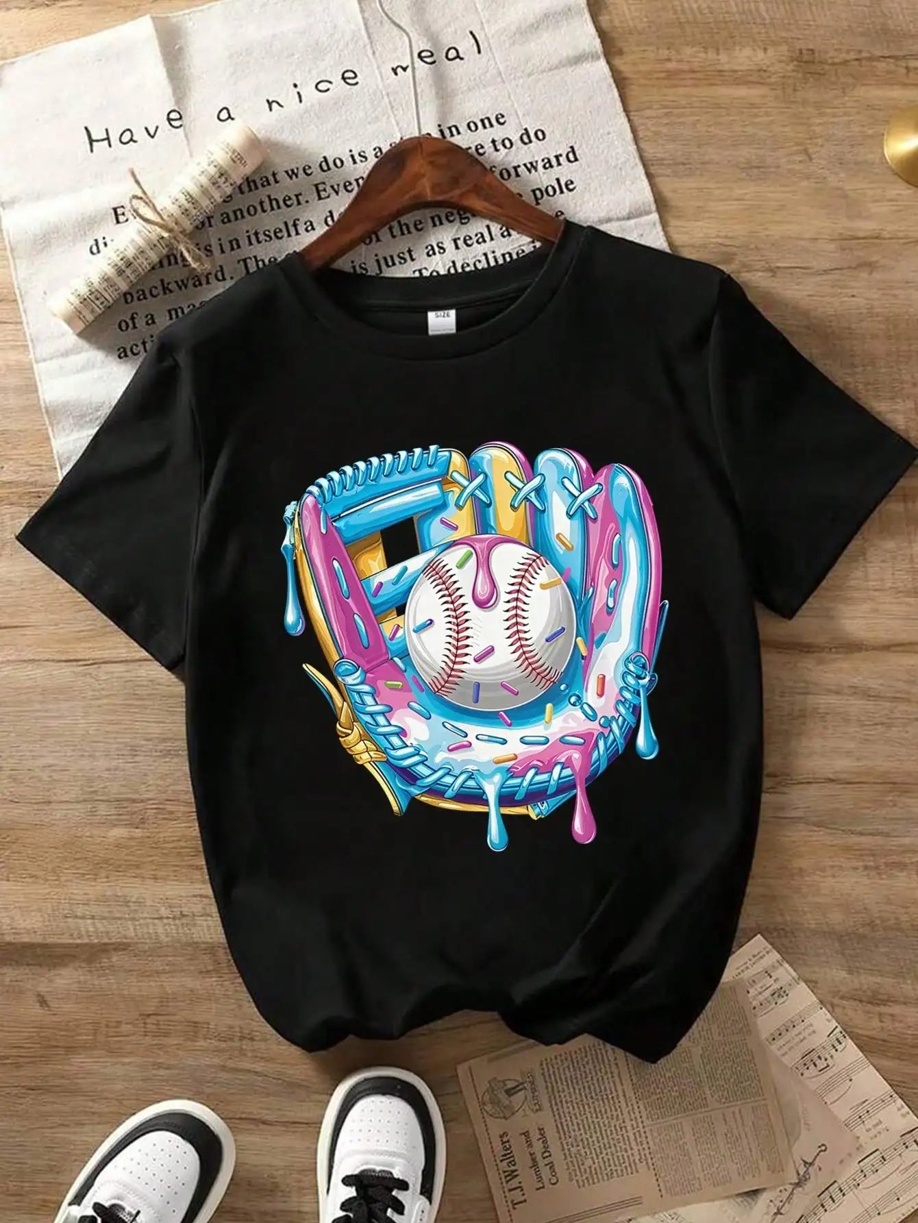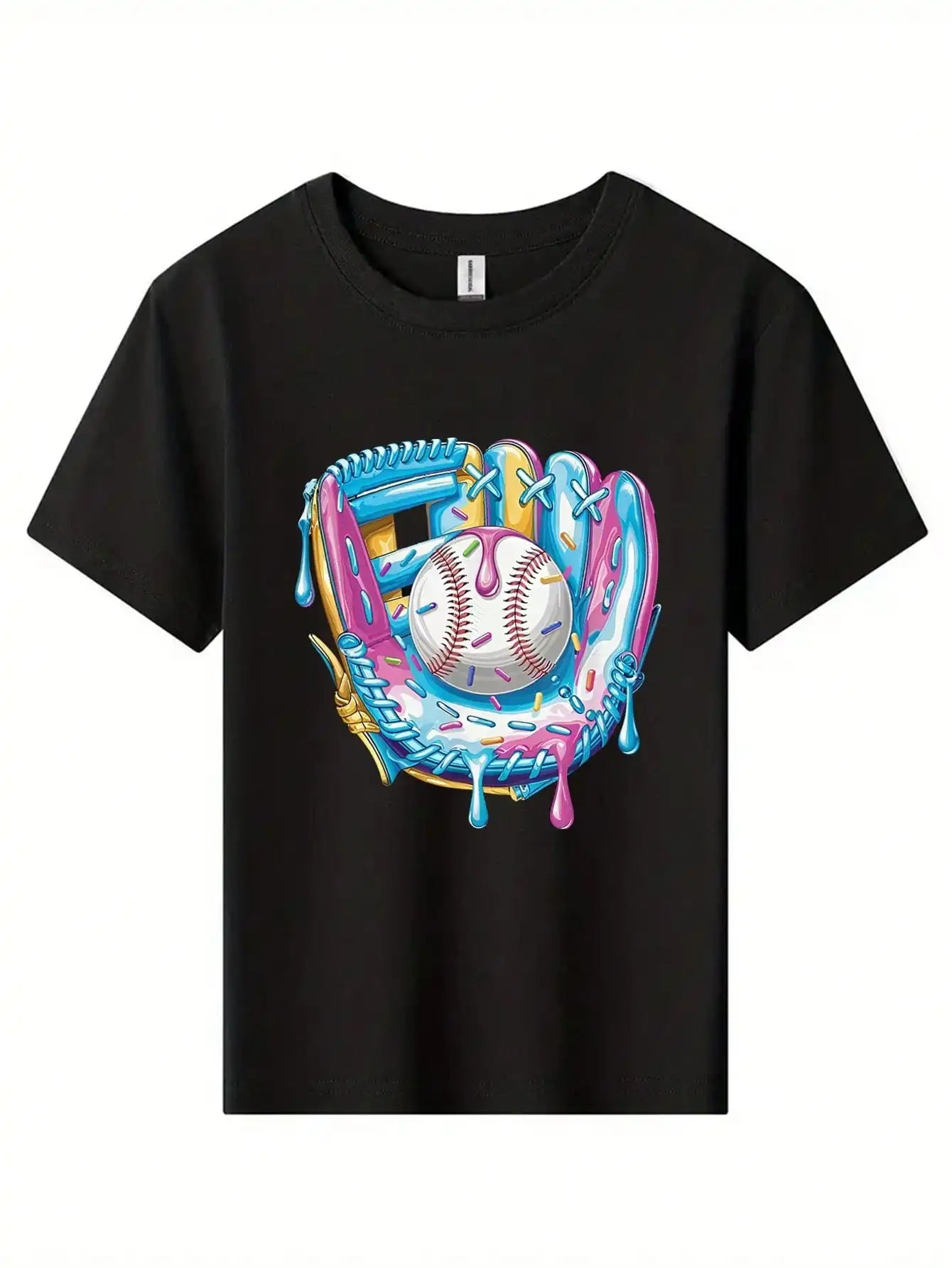 Tween Boys Baseball Cotton Graphic Tees, Black Vibrant Design Summer Tops With Colorful Baseball Artwork