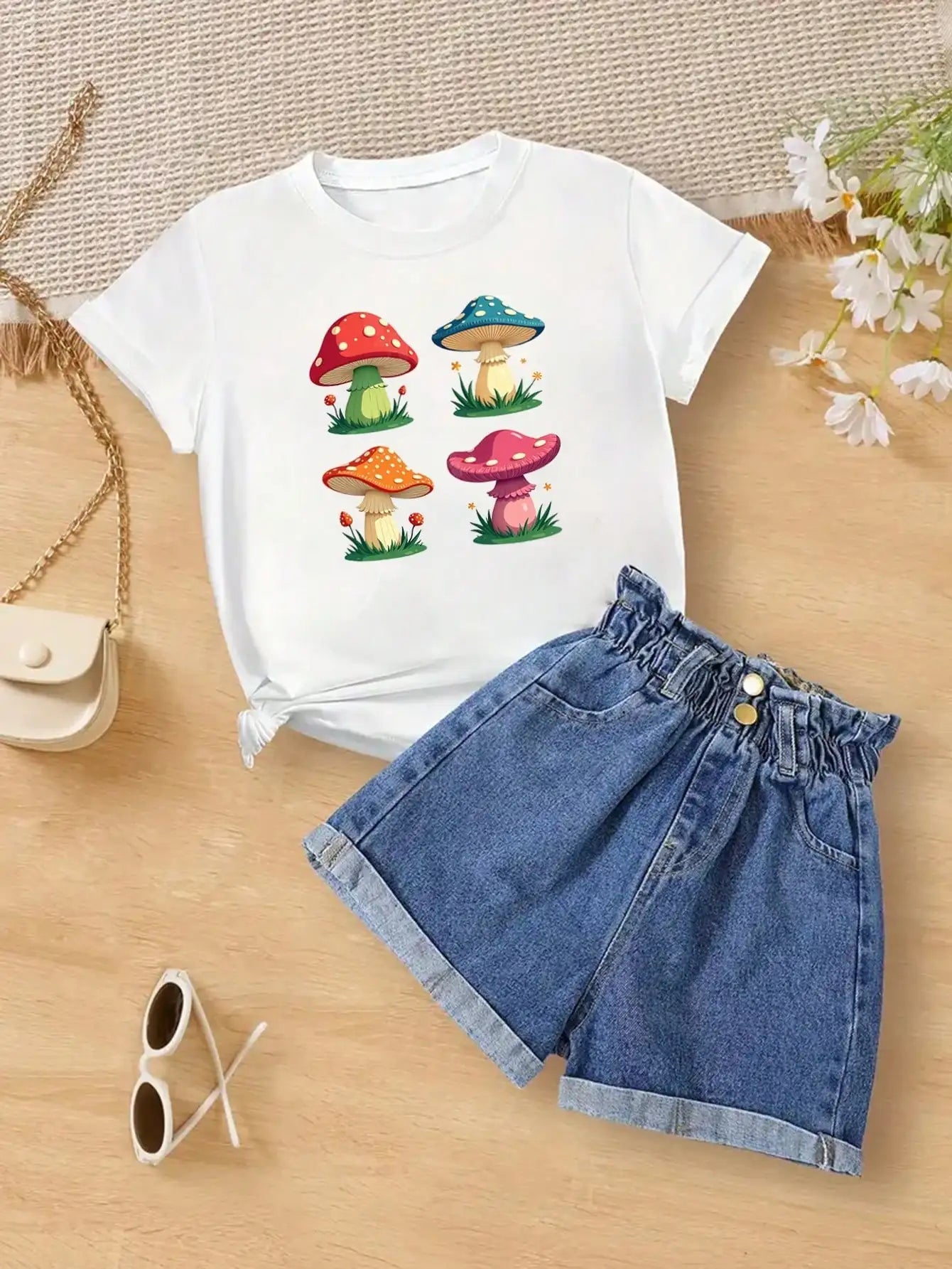 Tween Girls Cotton T-Shirt, White Tee With Colorful Mushrooms, Comfy & Cute Summer Tops