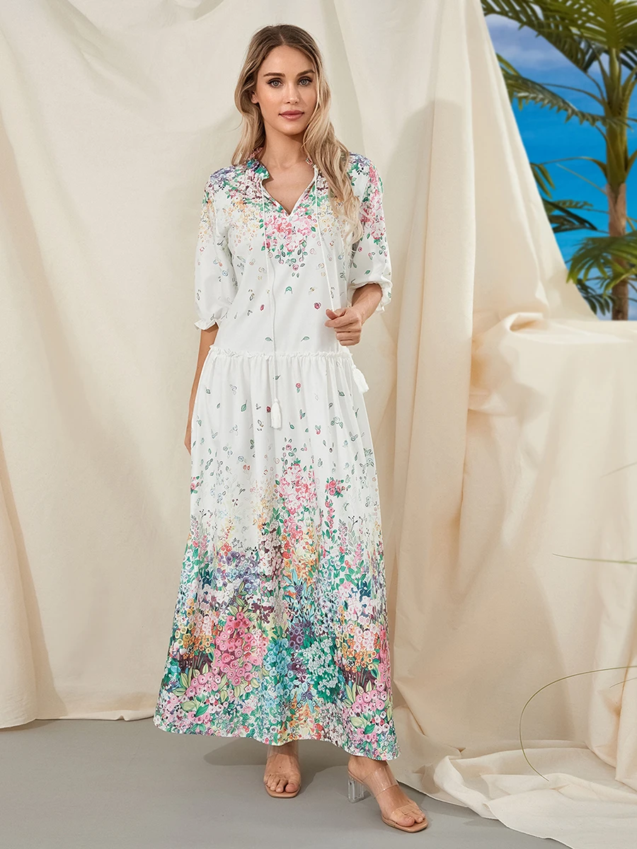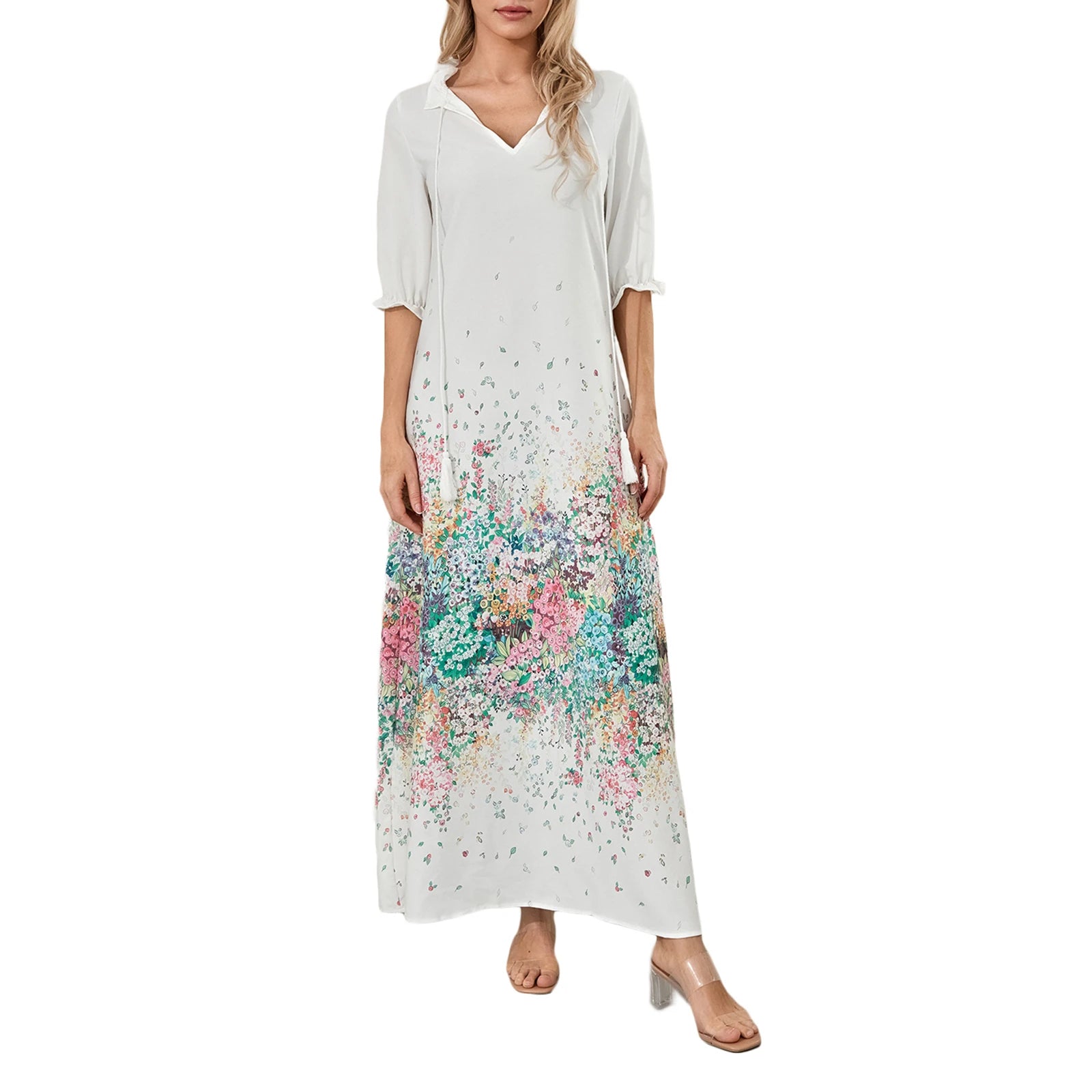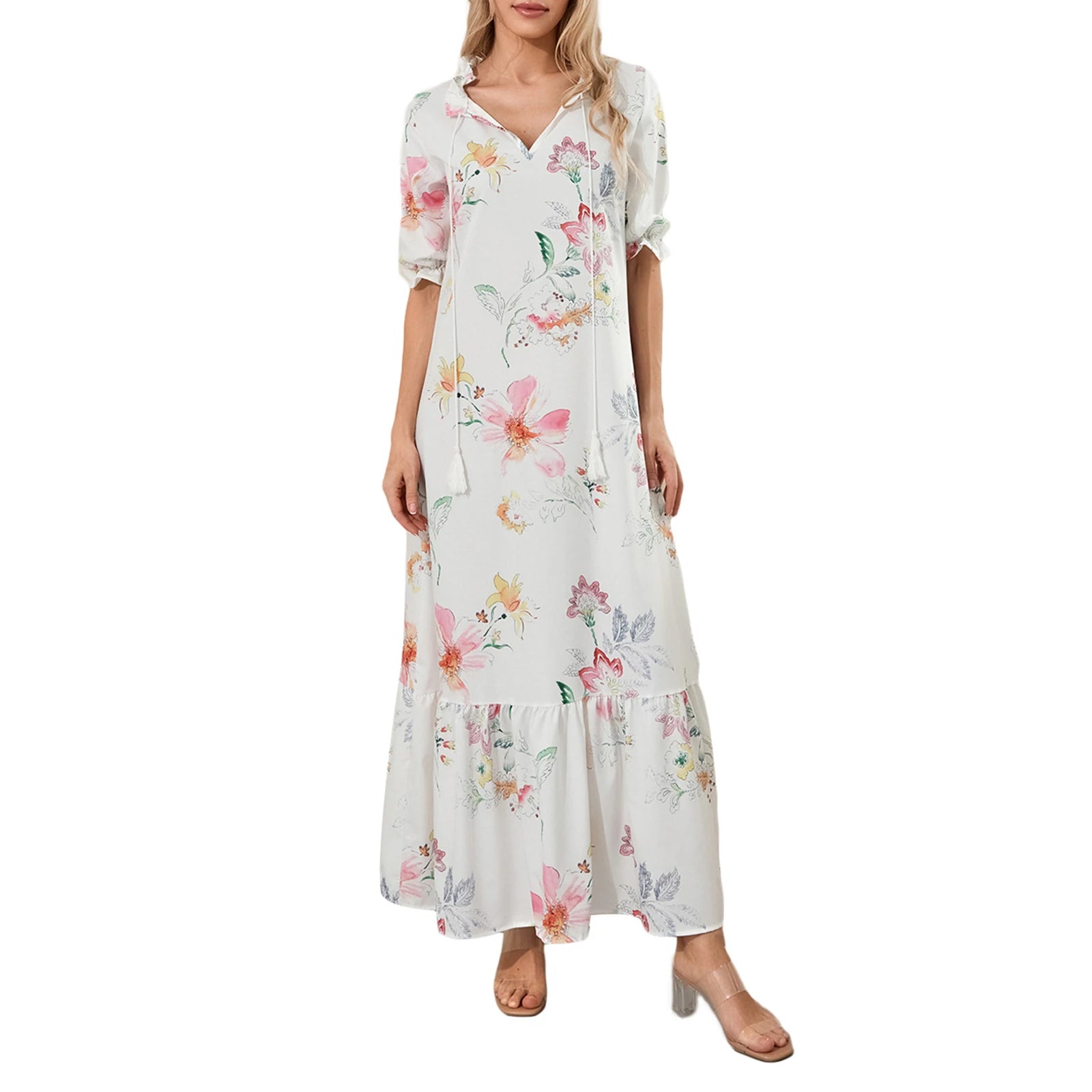 Women Long Dress Elegant Short Sleeve V Neck Flower Graphic Print Loose Swing Dress Summer Casual Dress
