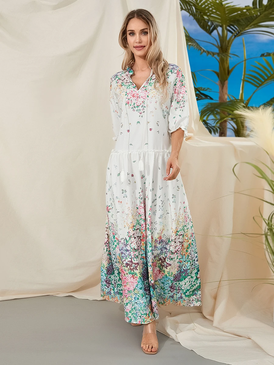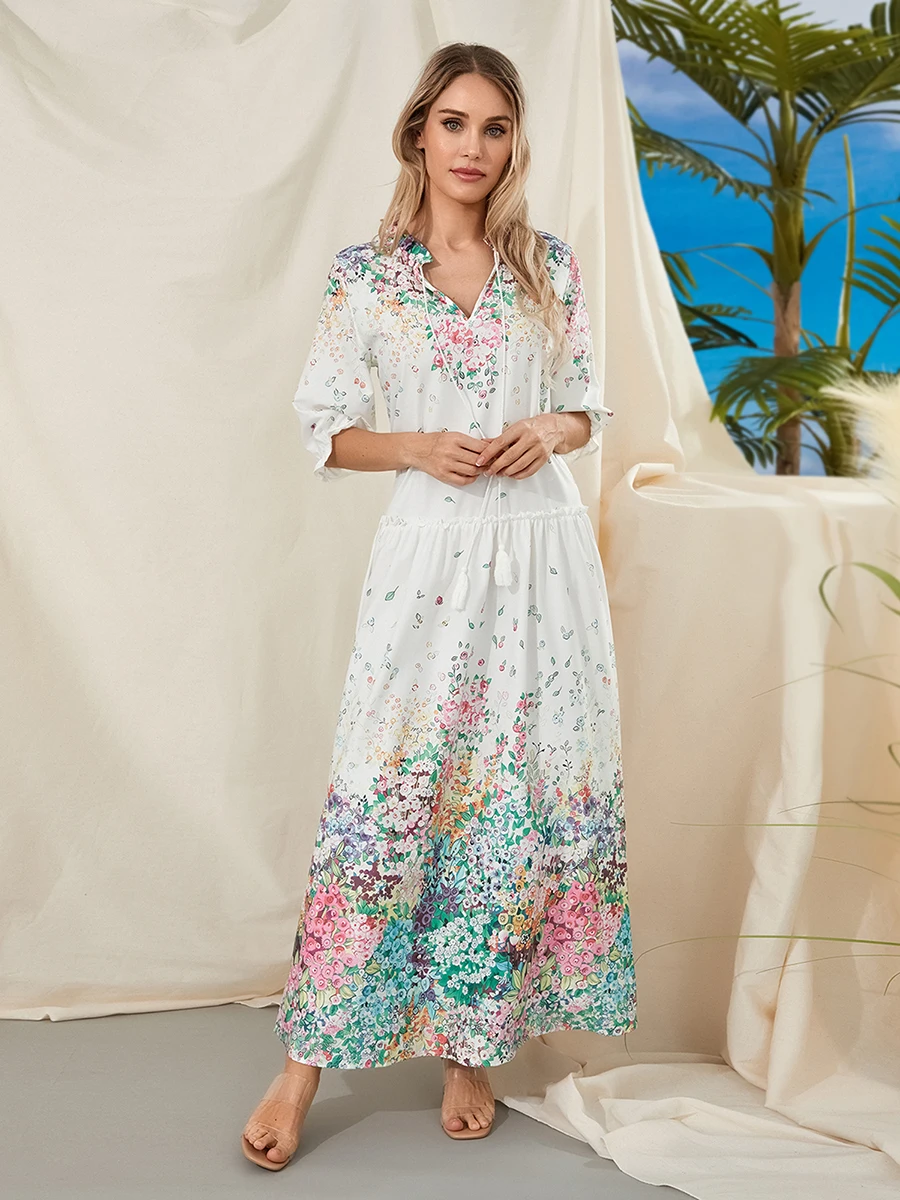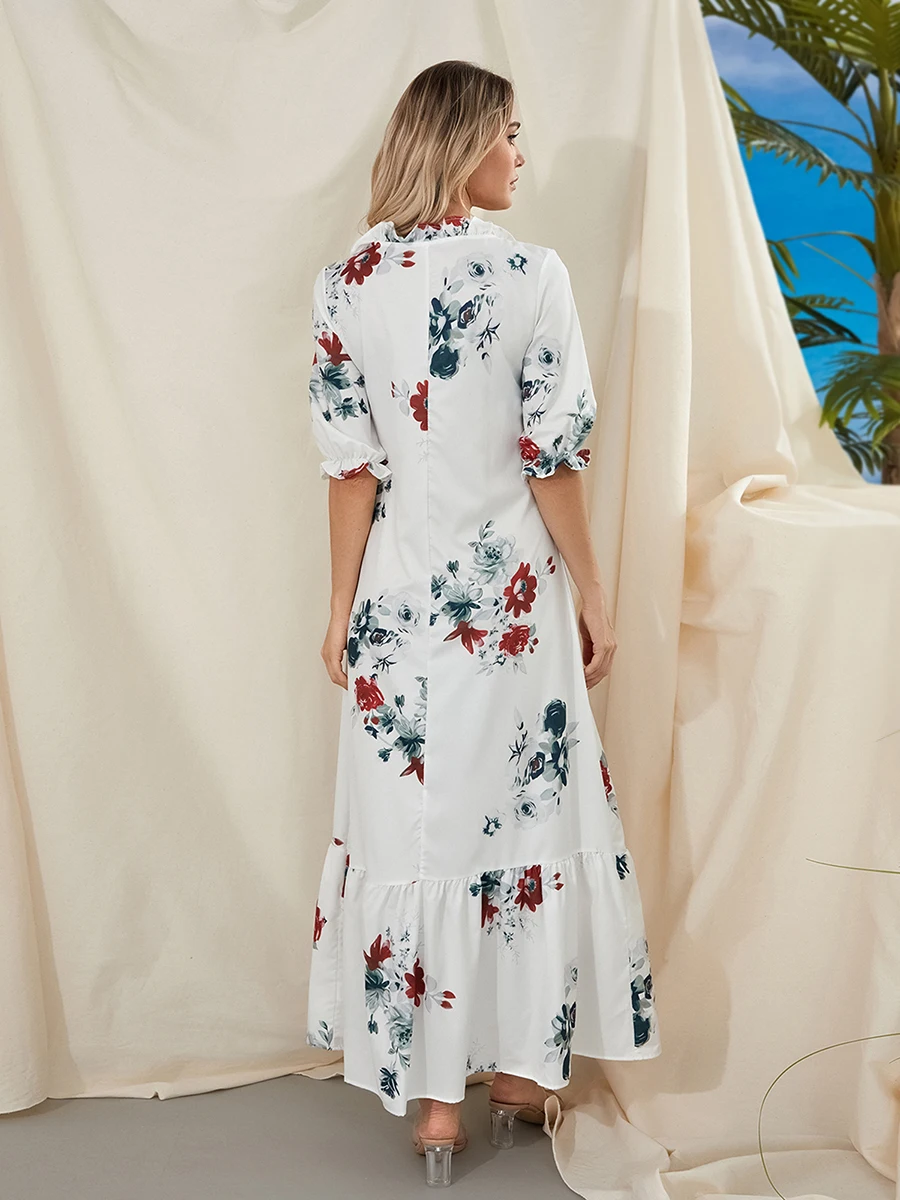 Women Long Dress Elegant Short Sleeve V Neck Flower Graphic Print Loose Swing Dress Summer Casual Dress