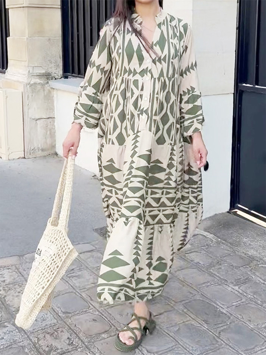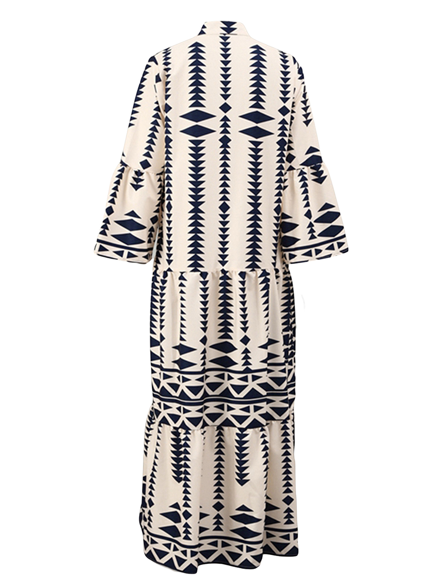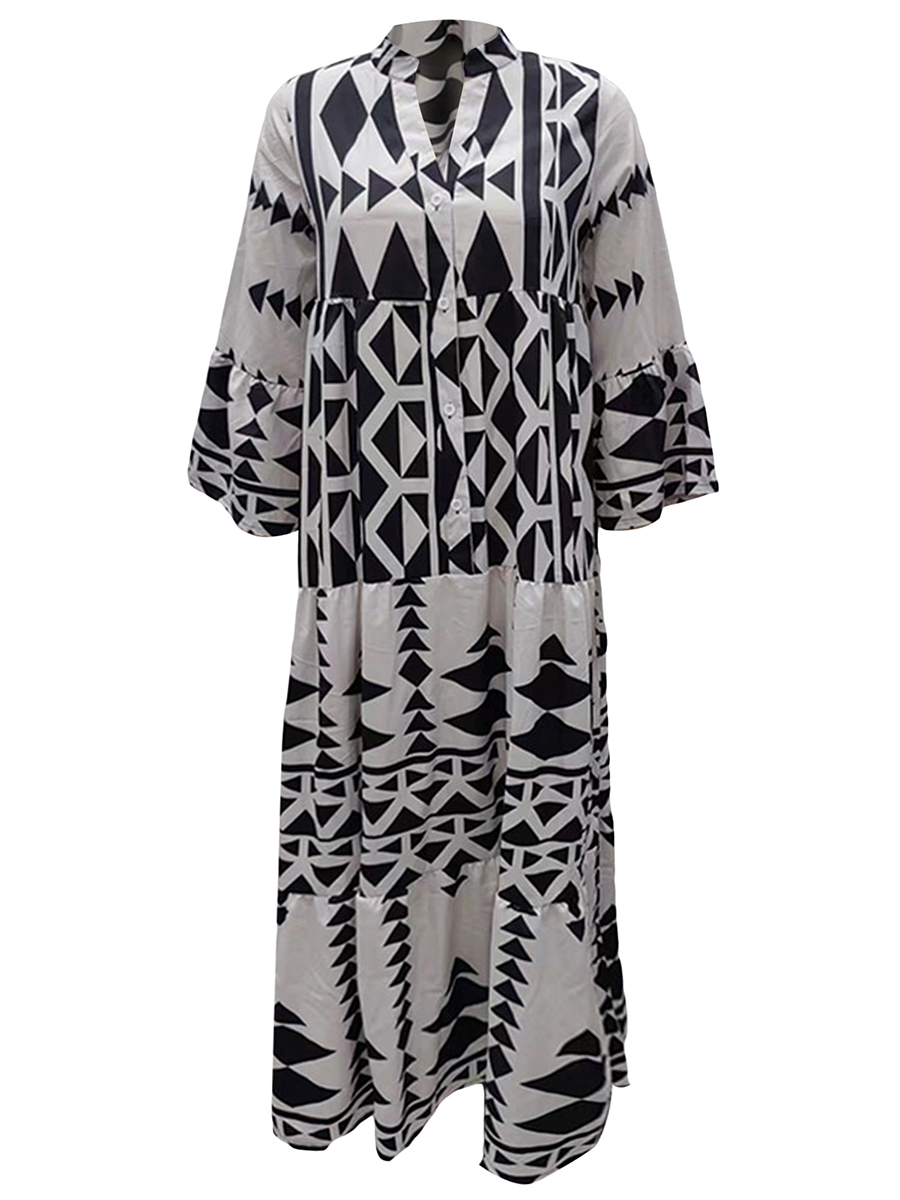 Women Long Dress Long Sleeve Button-down Geometric Print Bohe Dress Loose Swing Dress for Casual Daily