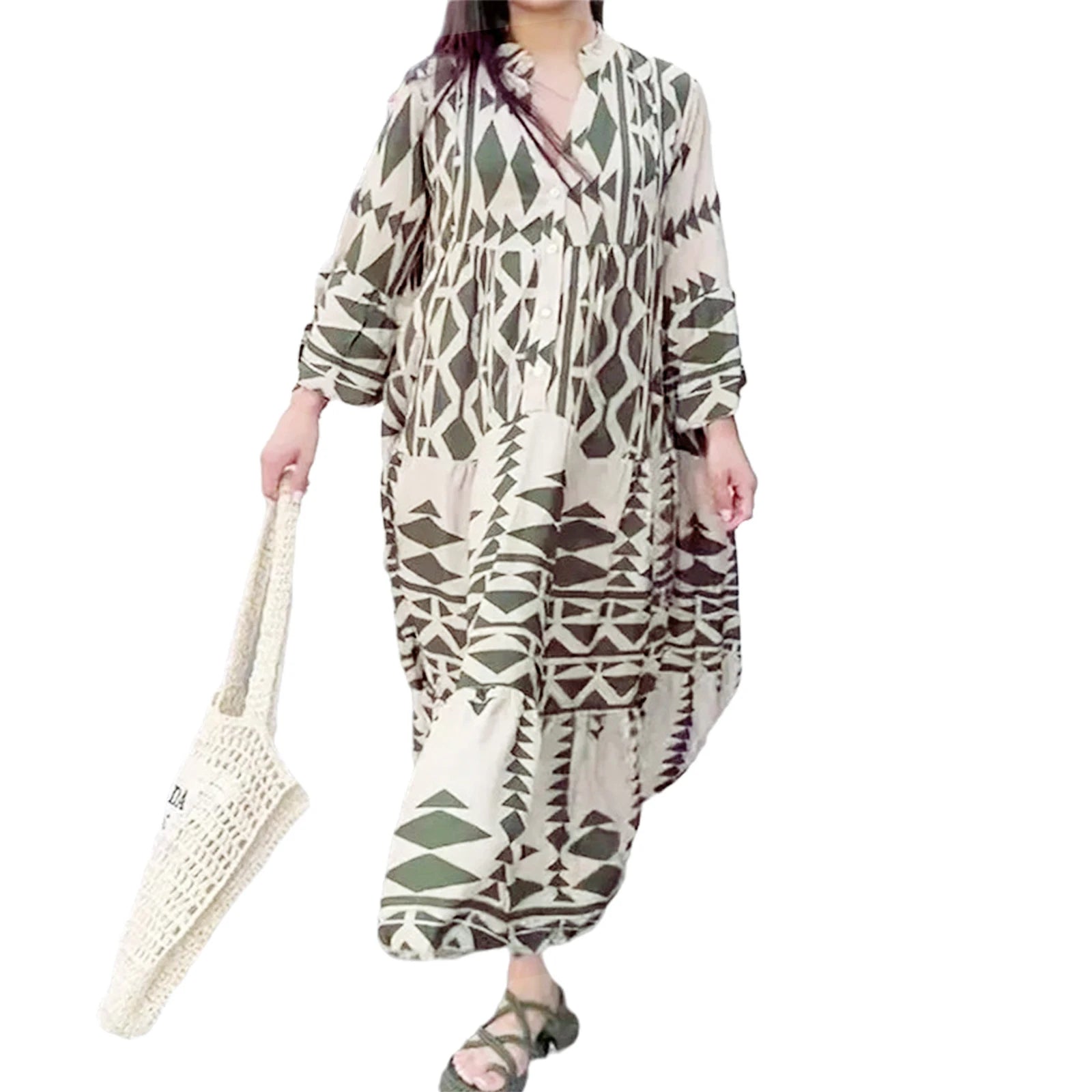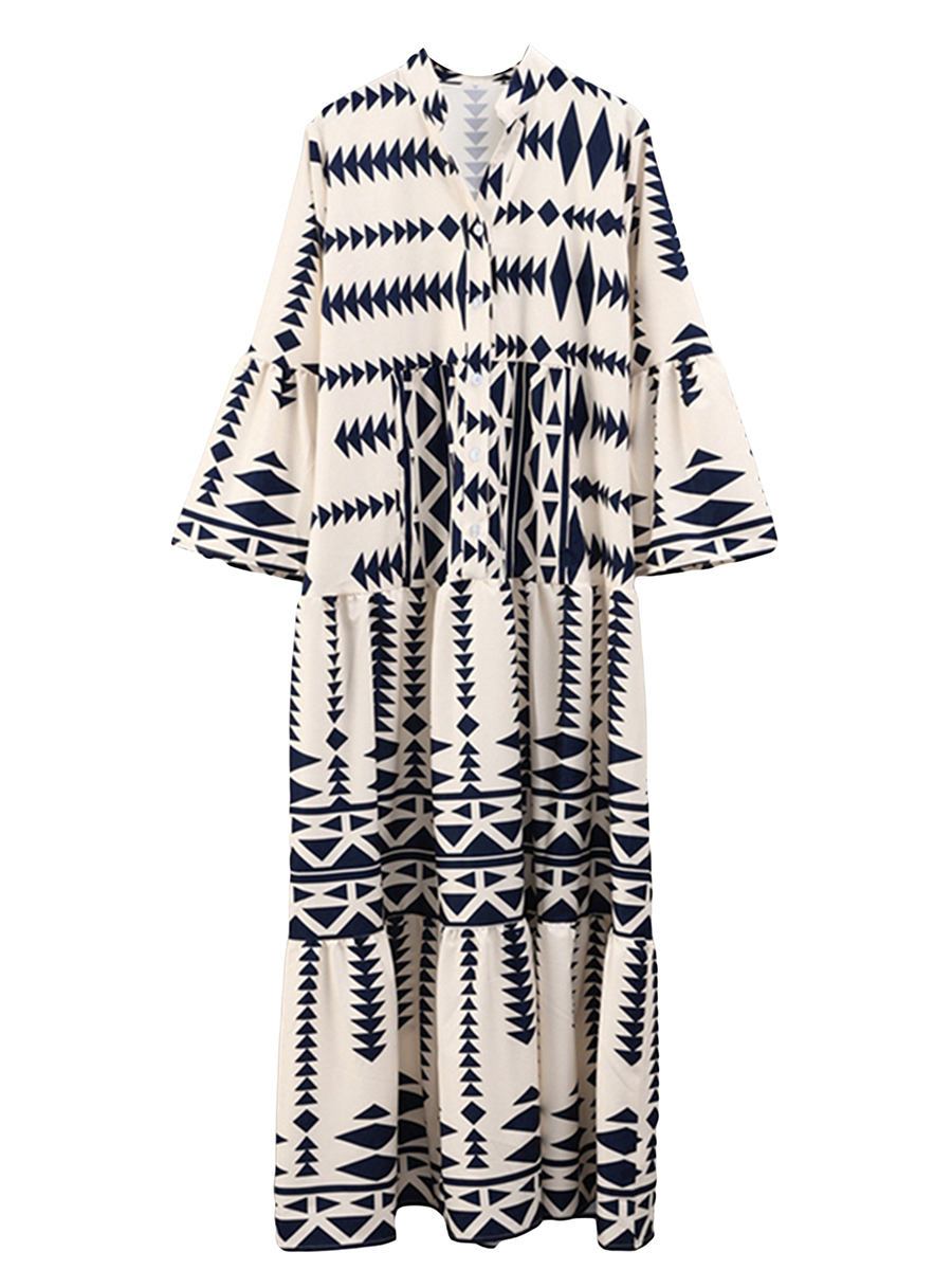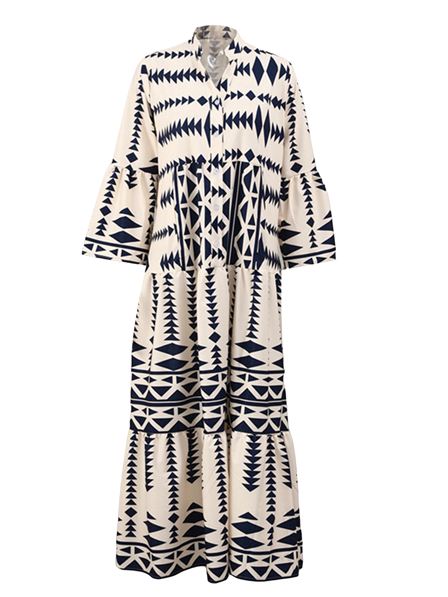 Women Long Dress Long Sleeve Button-down Geometric Print Bohe Dress Loose Swing Dress for Casual Daily