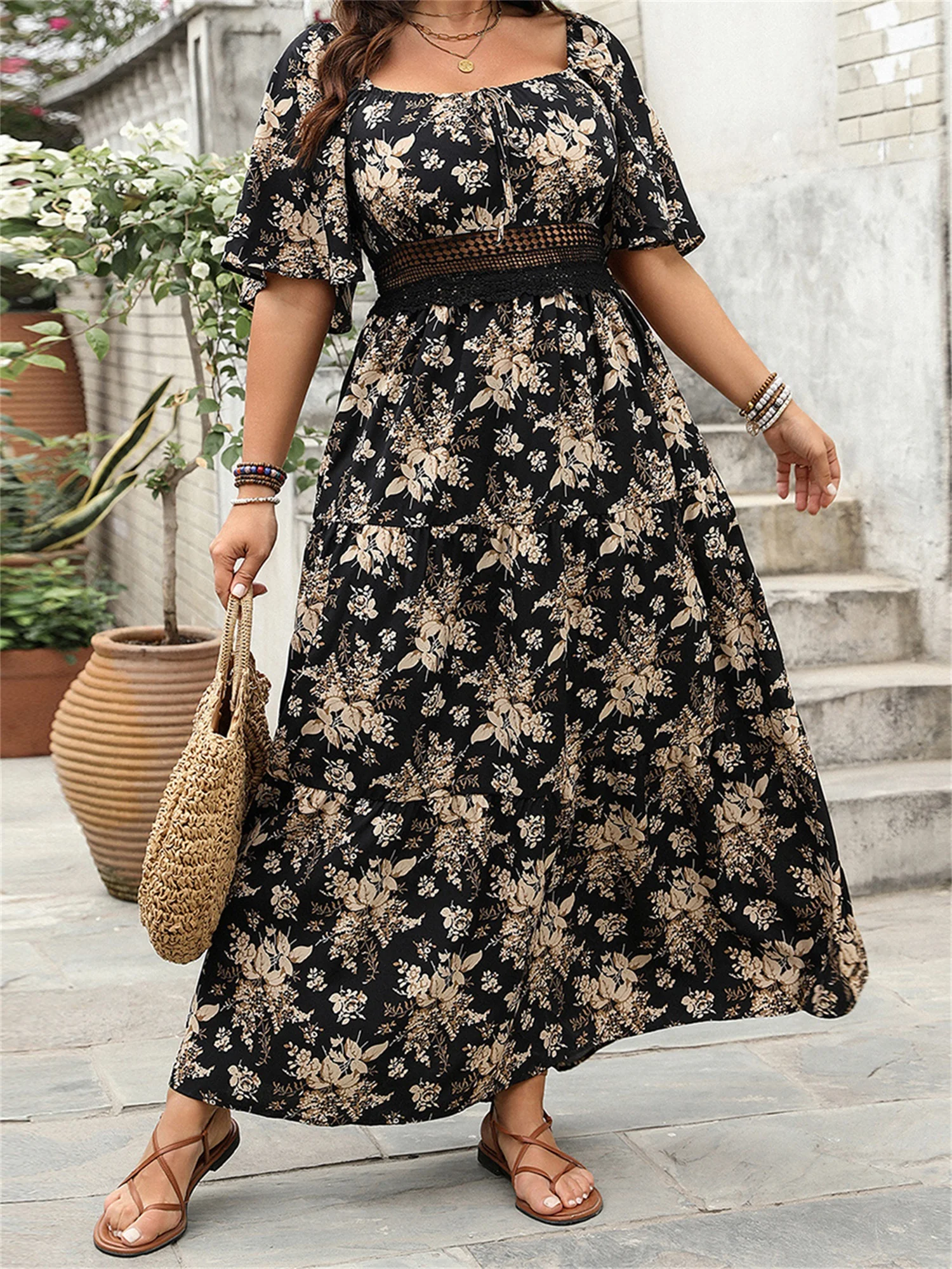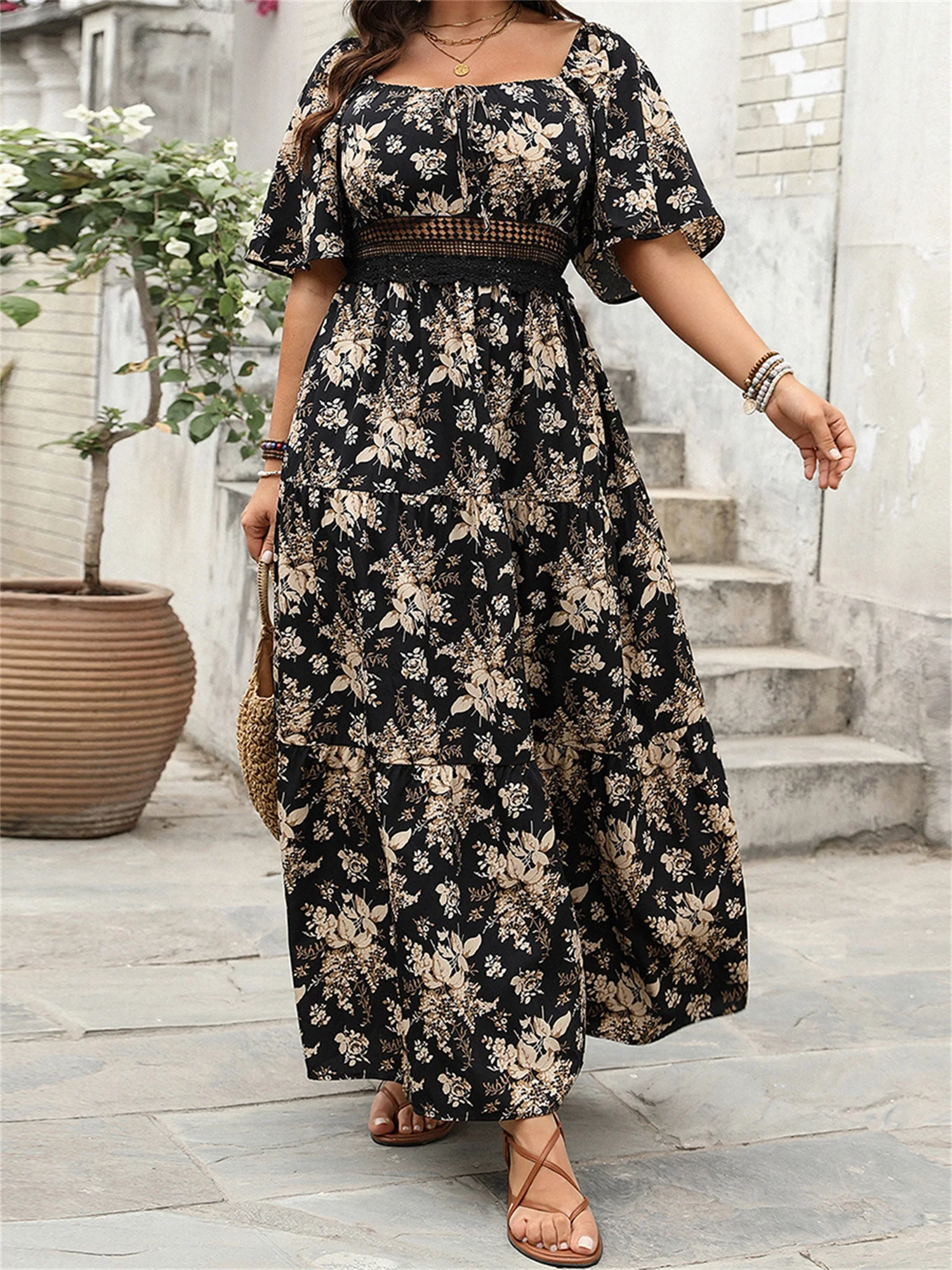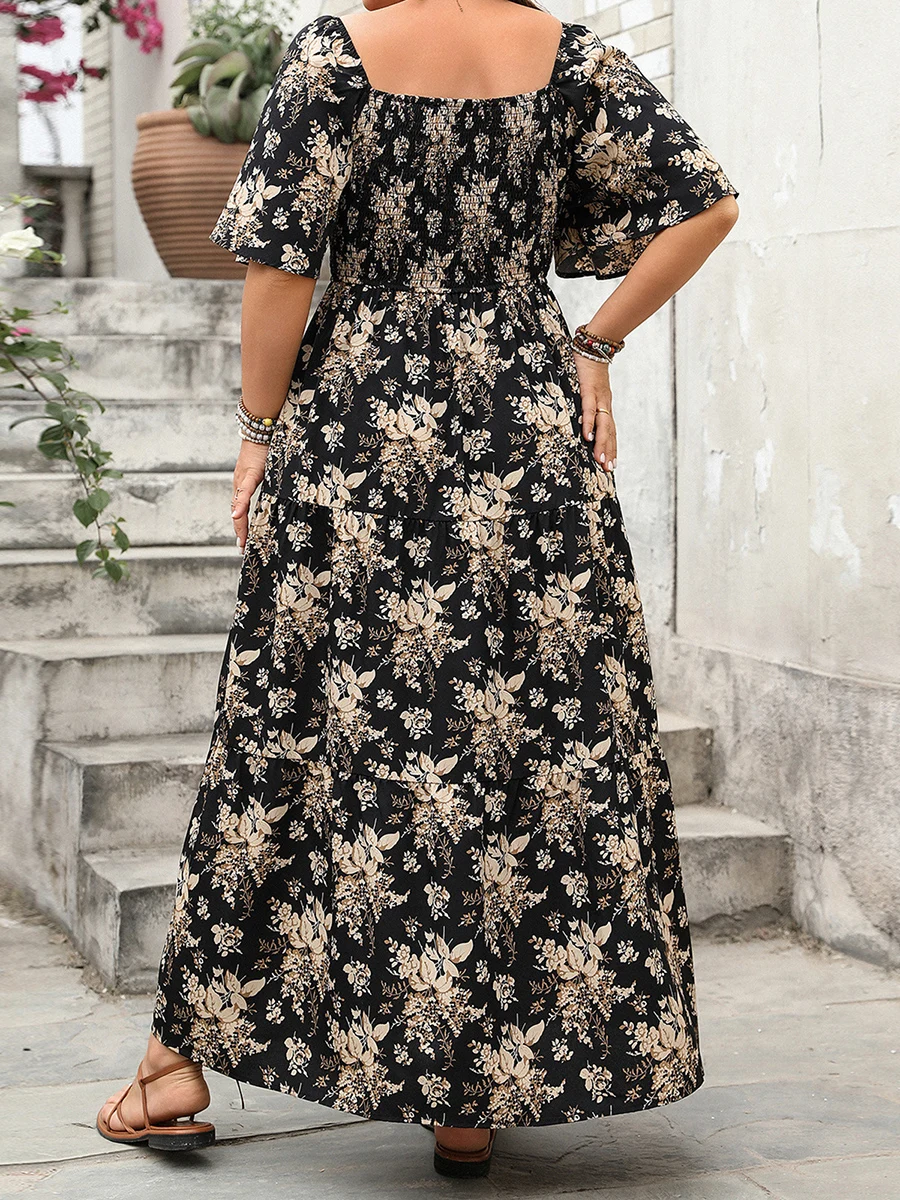 Women Long Dress, Elegant Short Sleeve Square Neck Flower Print Loose Summer Casual Dress