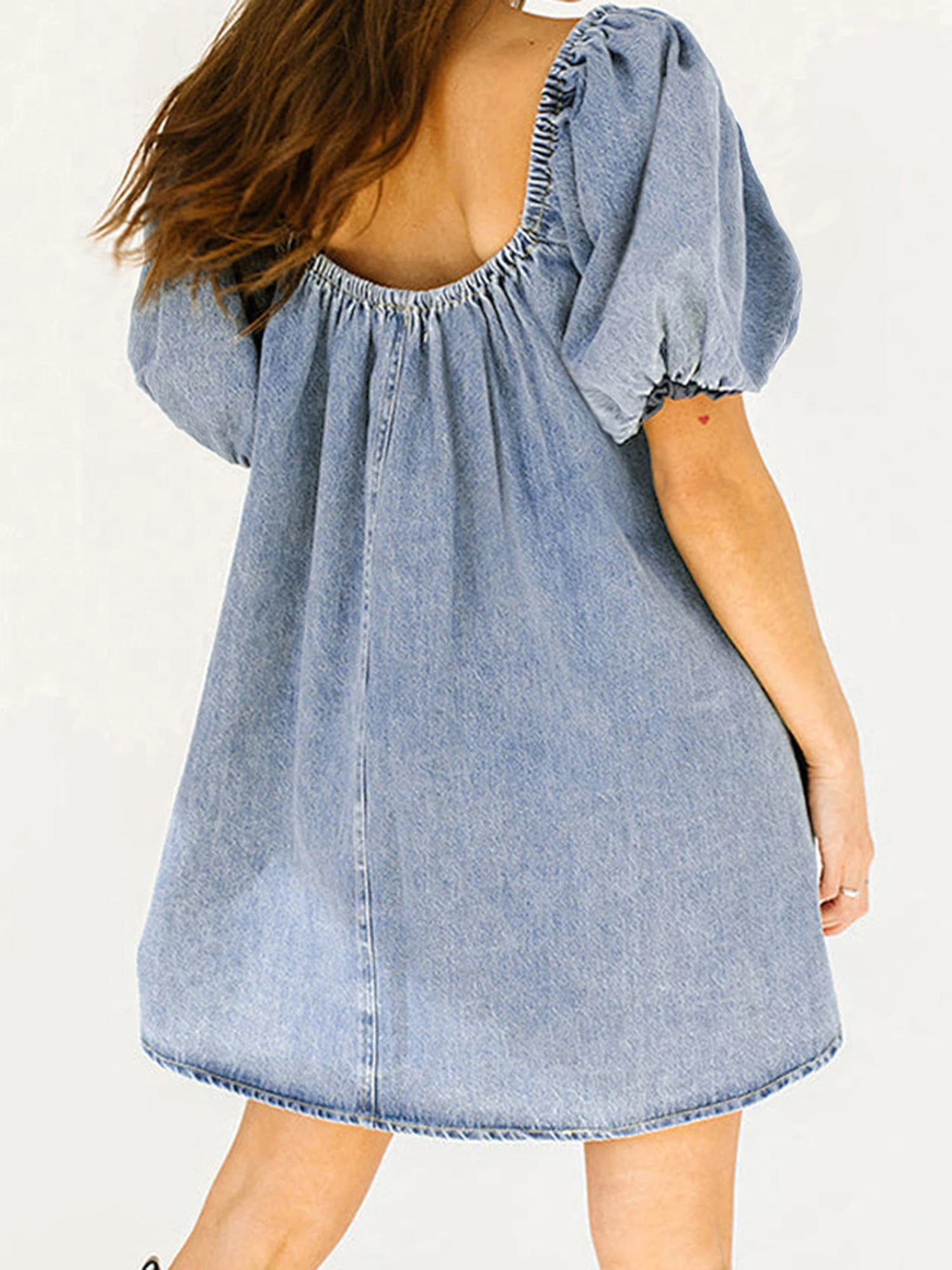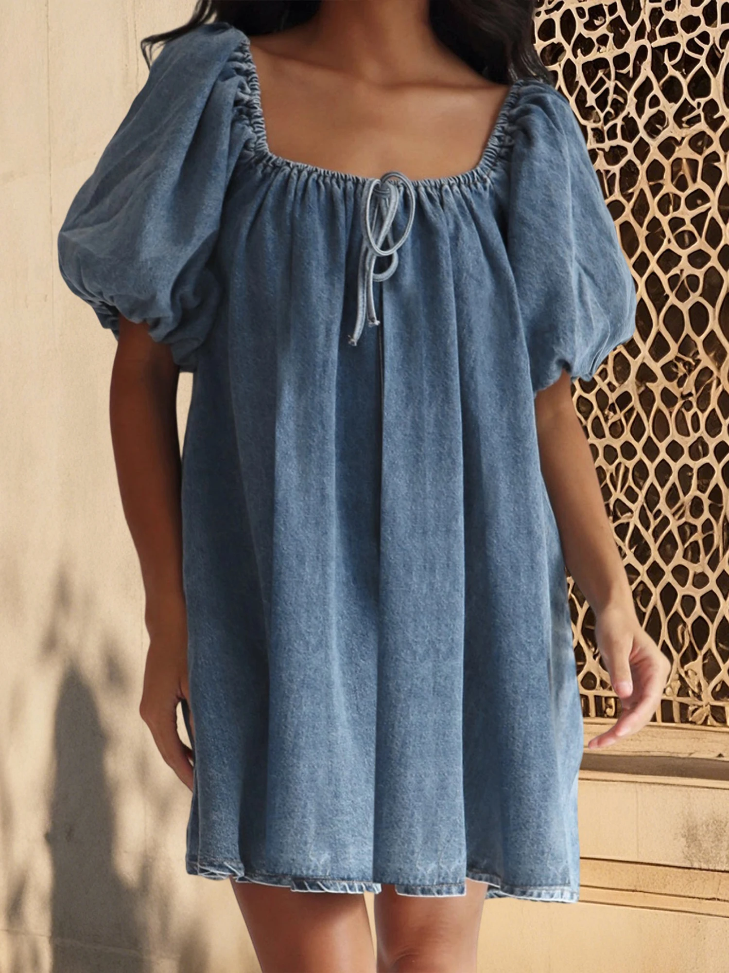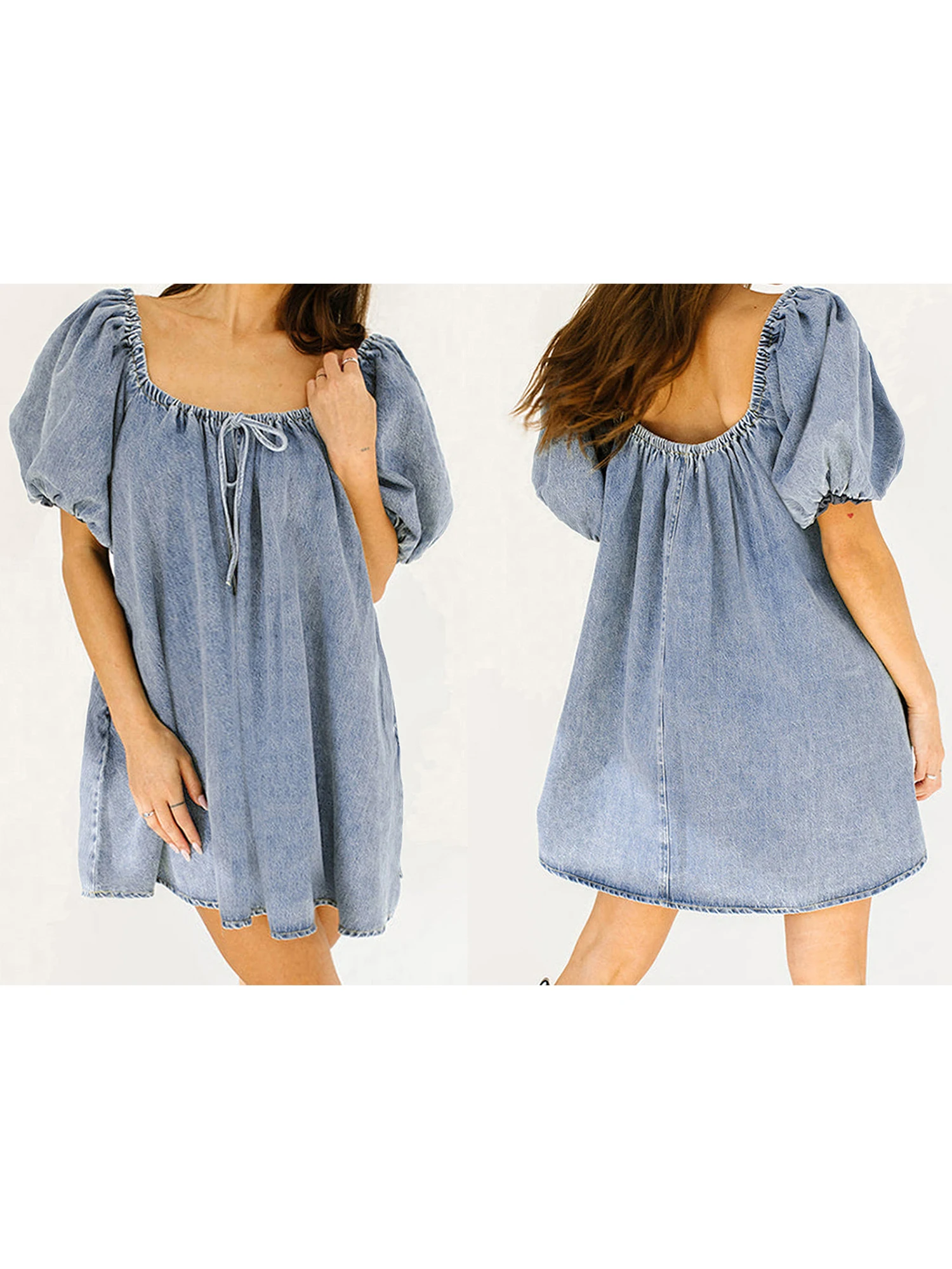 Women s Denim Dress with Short Sleeves and Square Neckline Solid Color Loose Fit Mini Dress for Summer Casual Wear