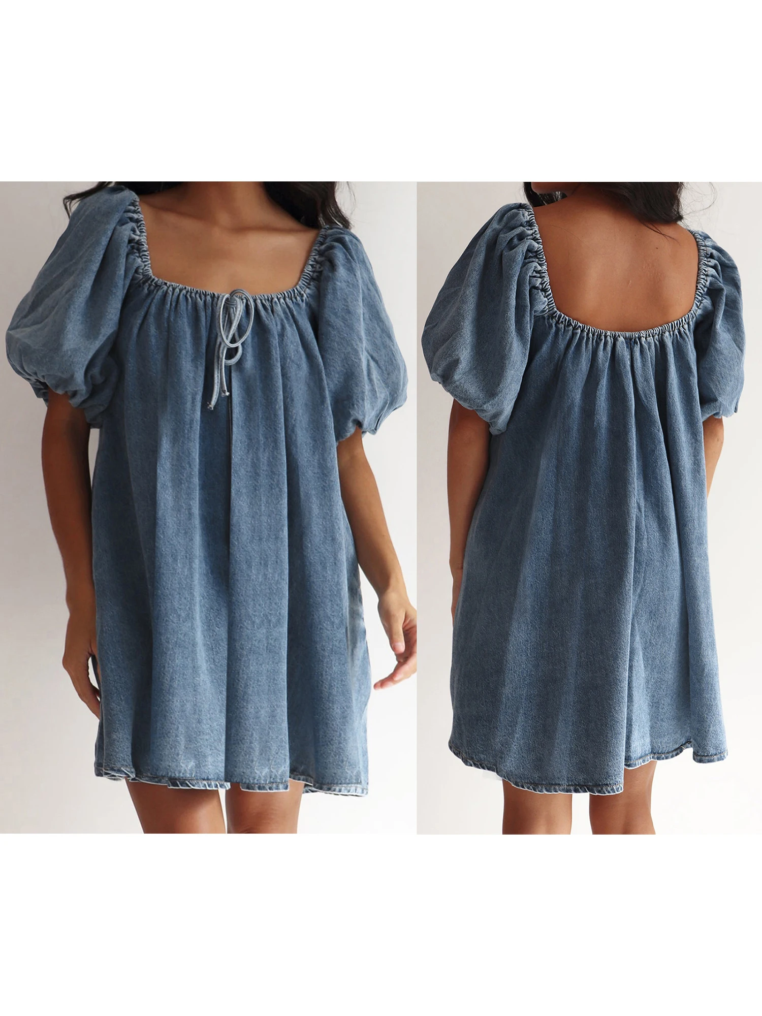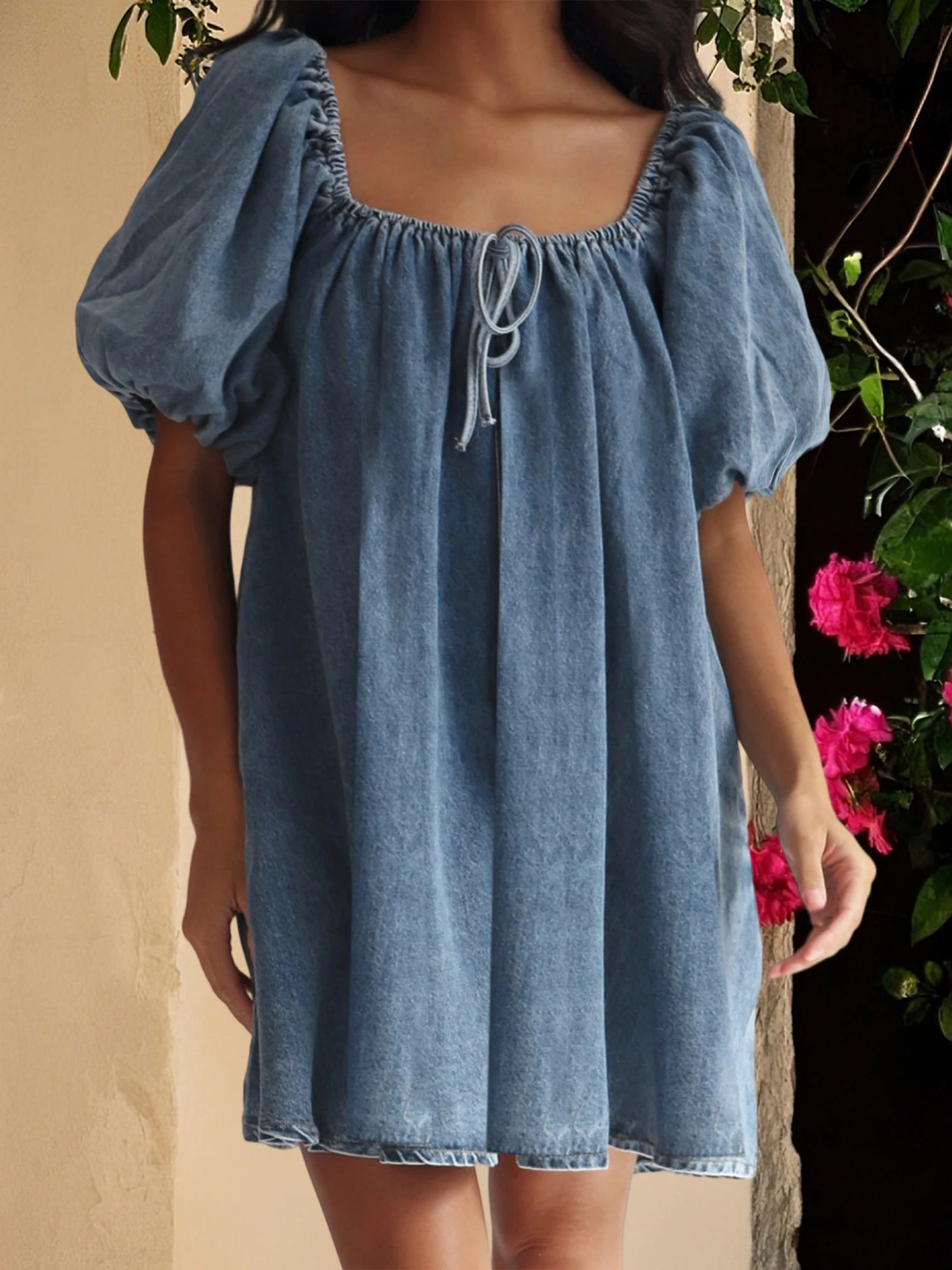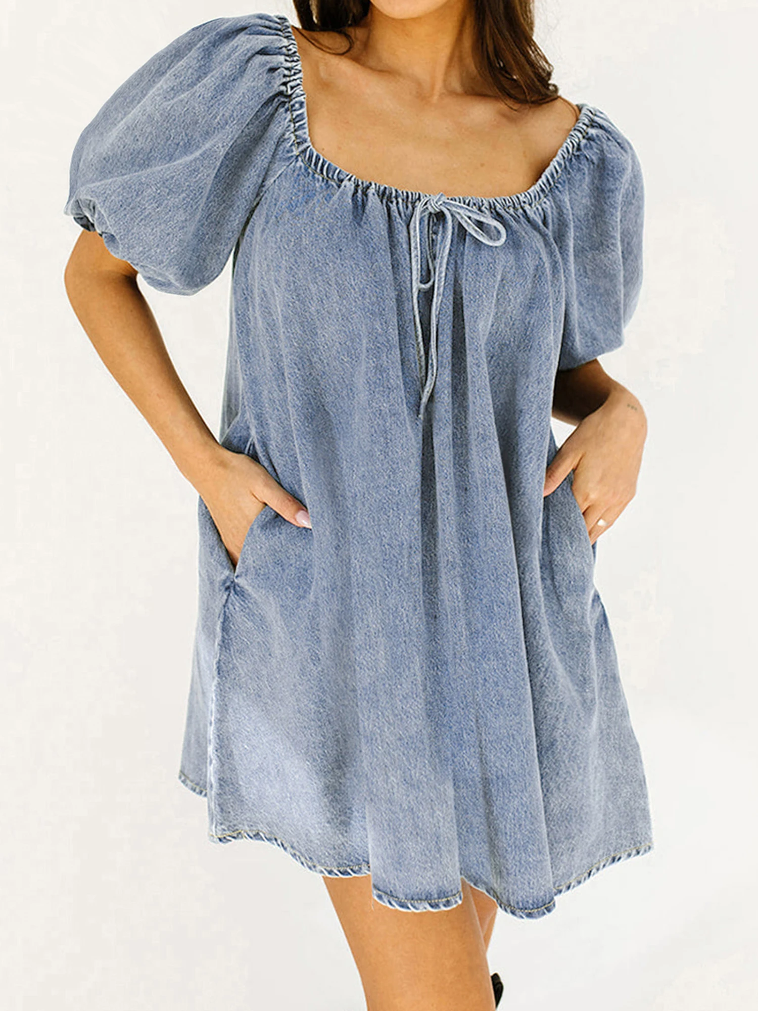 Women s Denim Dress with Short Sleeves and Square Neckline Solid Color Loose Fit Mini Dress for Summer Casual Wear