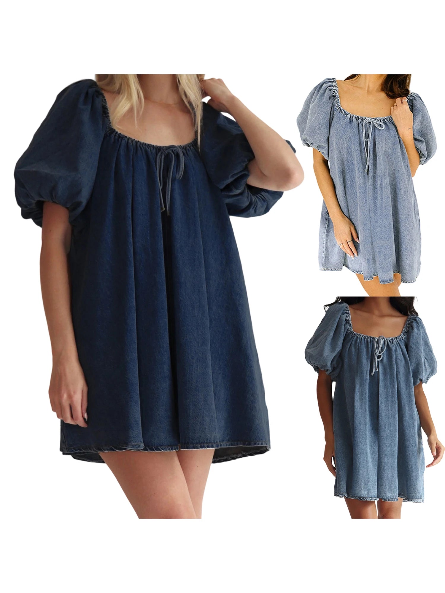 Women Denim Dress Short Sleeve Square Neck Solid Loose Mini Dress Summer Dress for Casual Daily