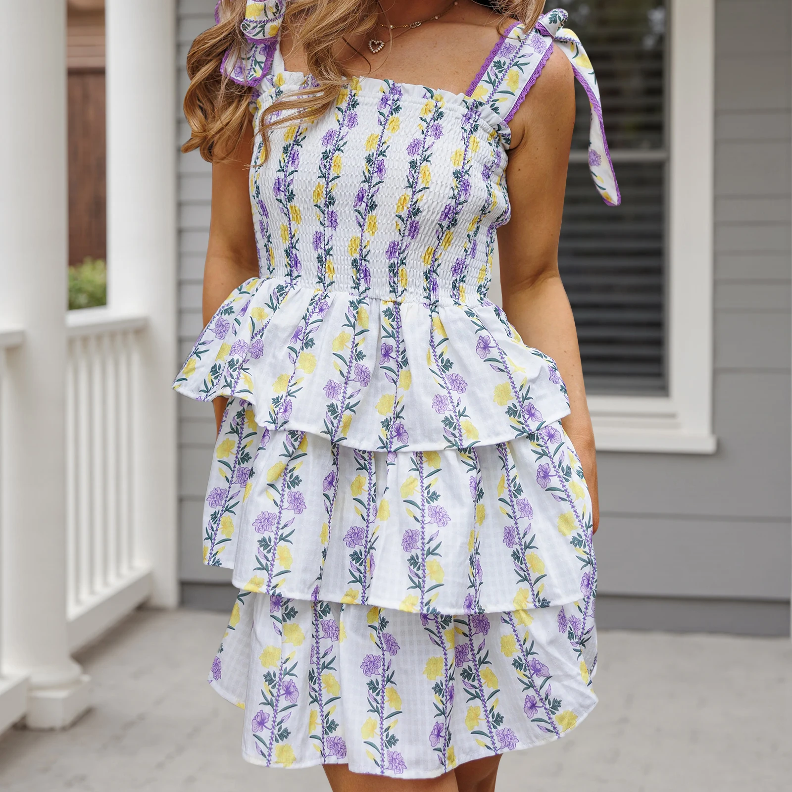 Womens Tie Shoulder Dress Summer Sleeveless Floral Print Smocked Bust Dress Short Flowy Dress