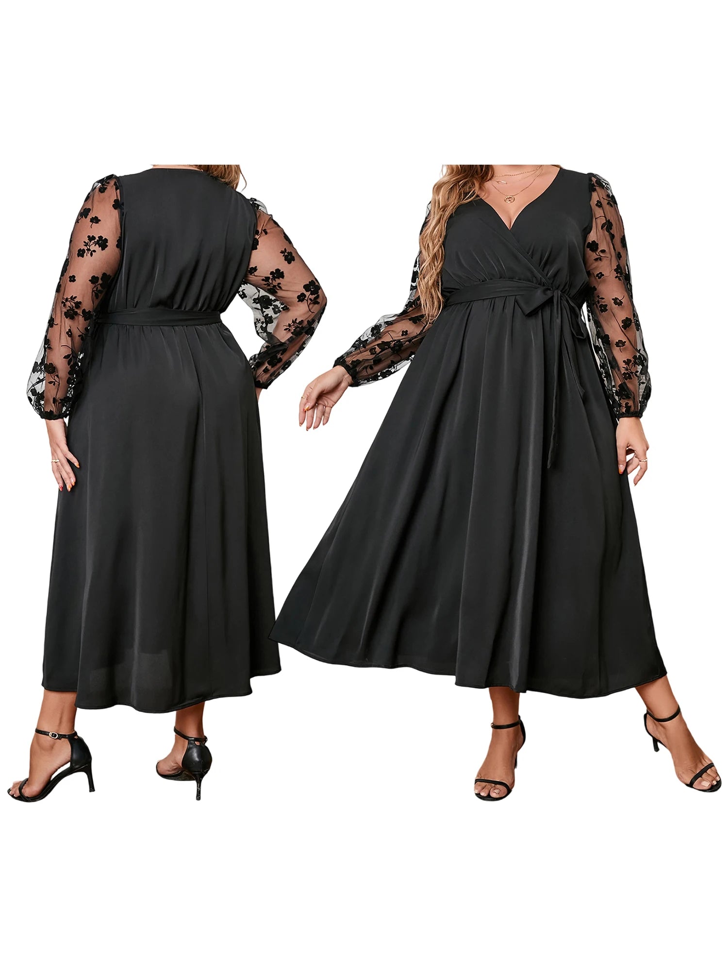 Women's Plus Size Satin Dress Floral Mesh Long Sleeve Wrap V-Neck A Line Dress with Belt for Spring Fall