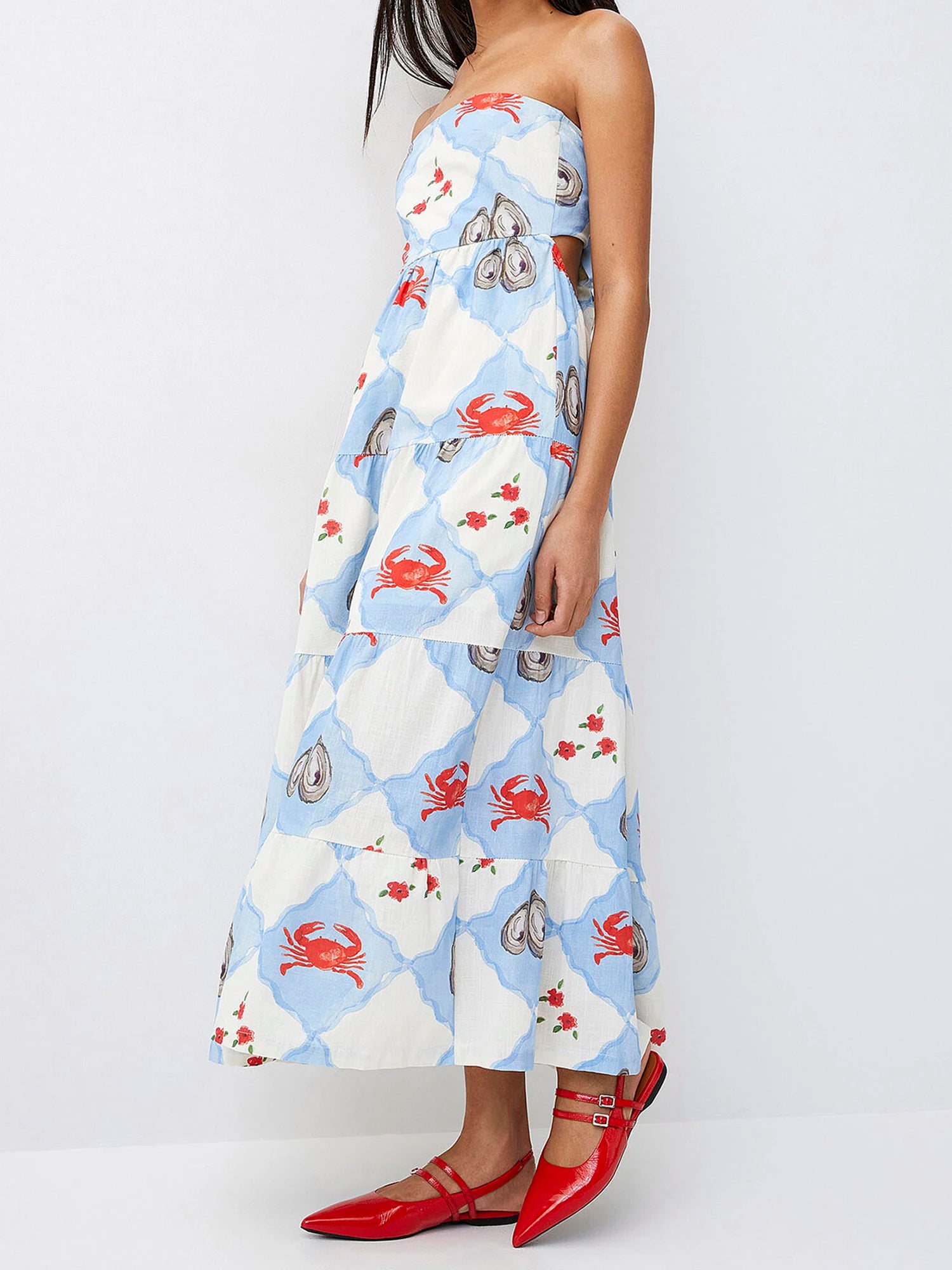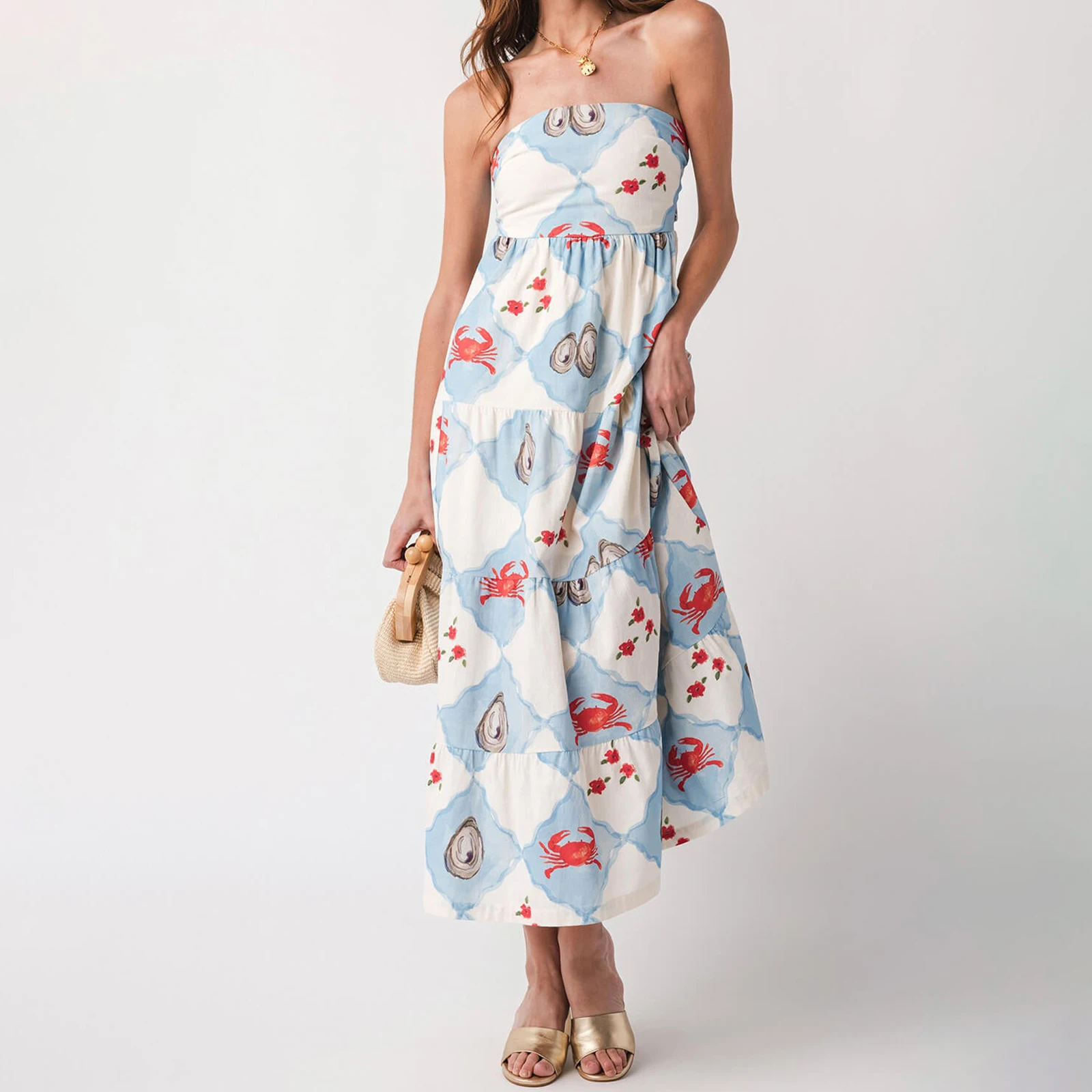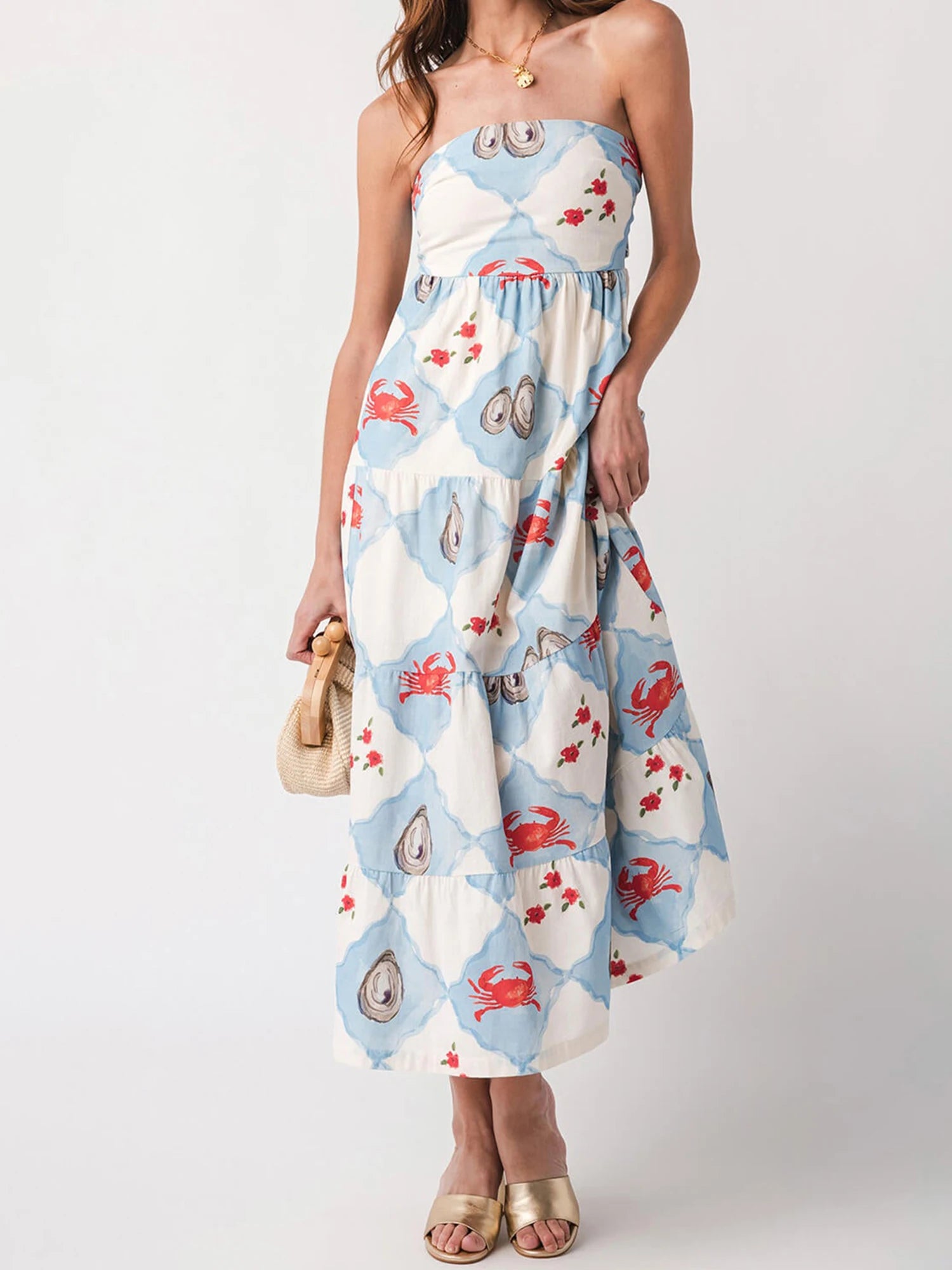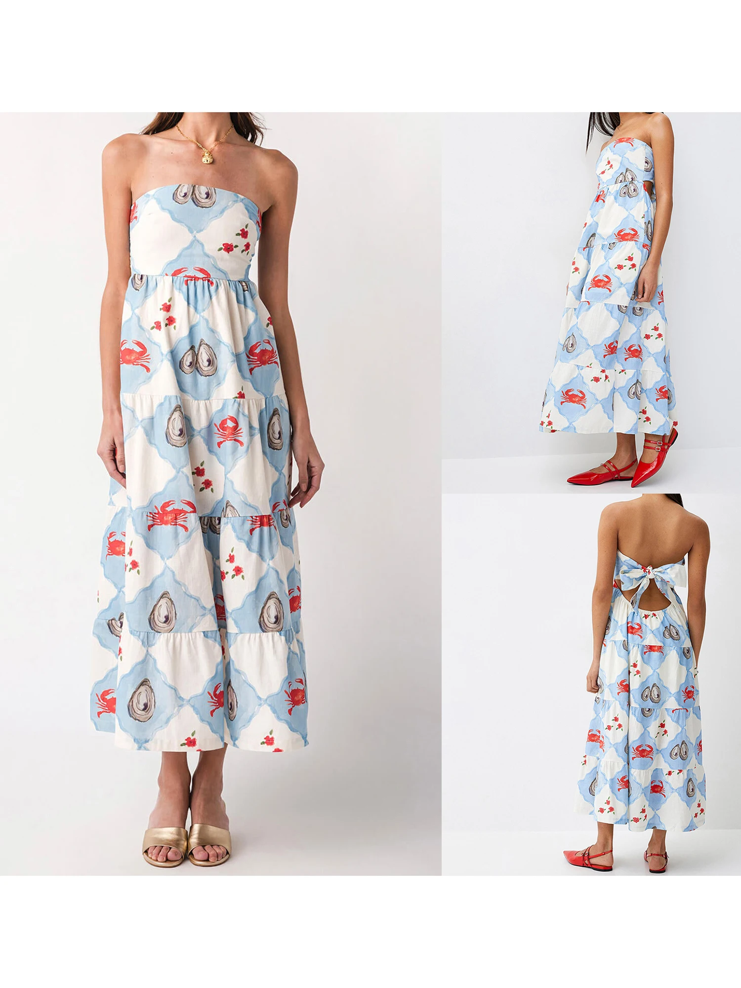 Women's Summer Tube Dress Floral Lobster Print Back Bowknot Strapless Flowy Long Dress