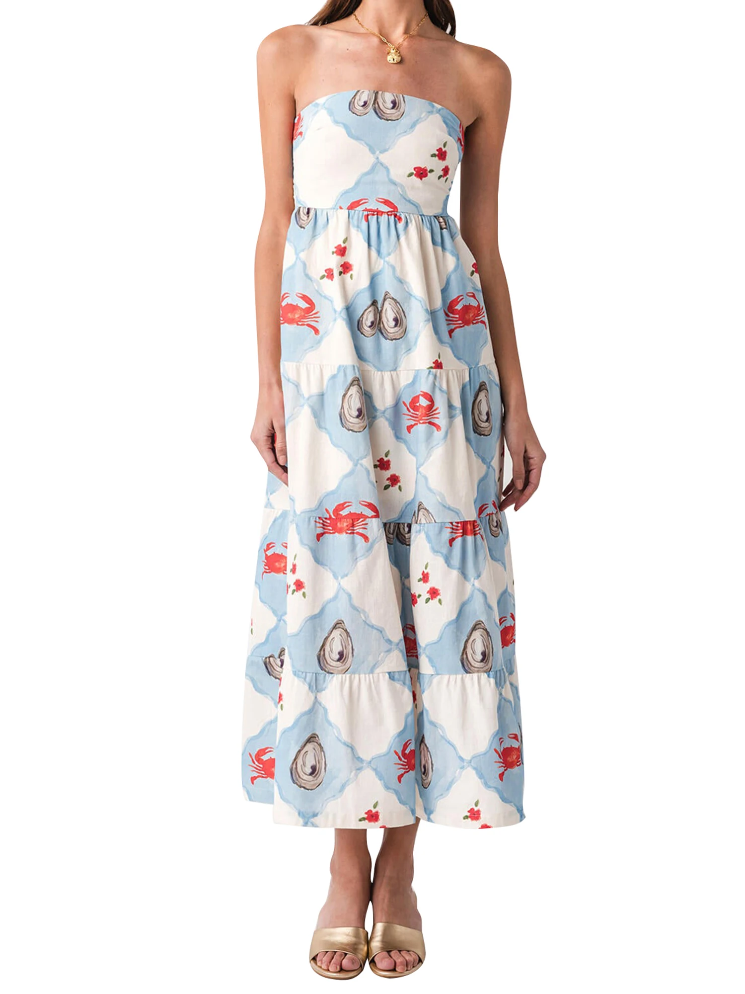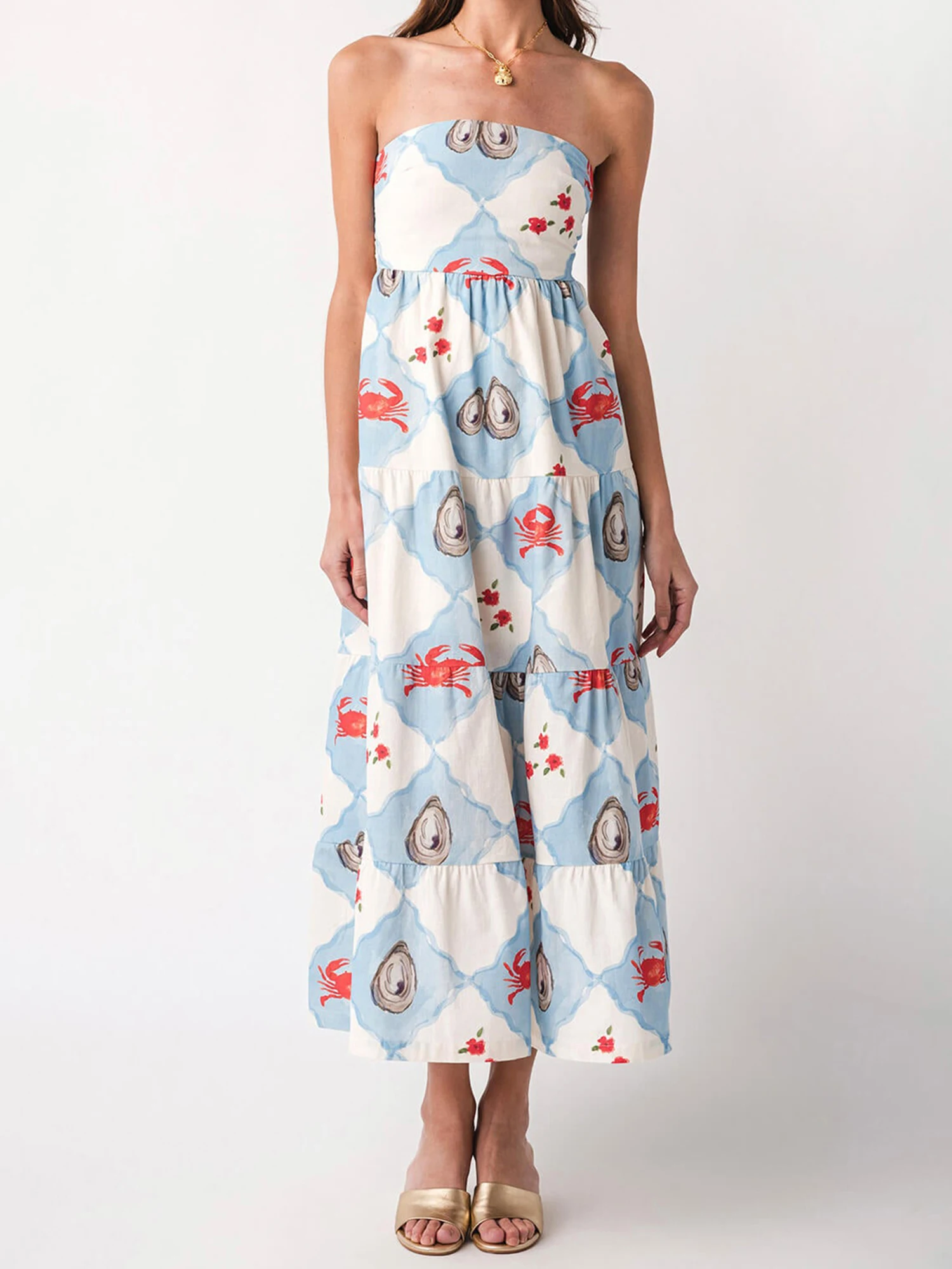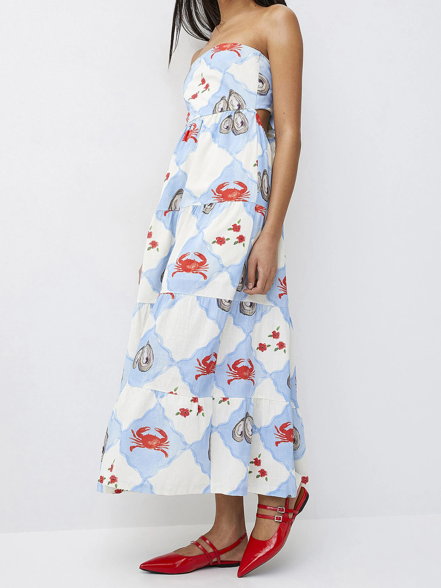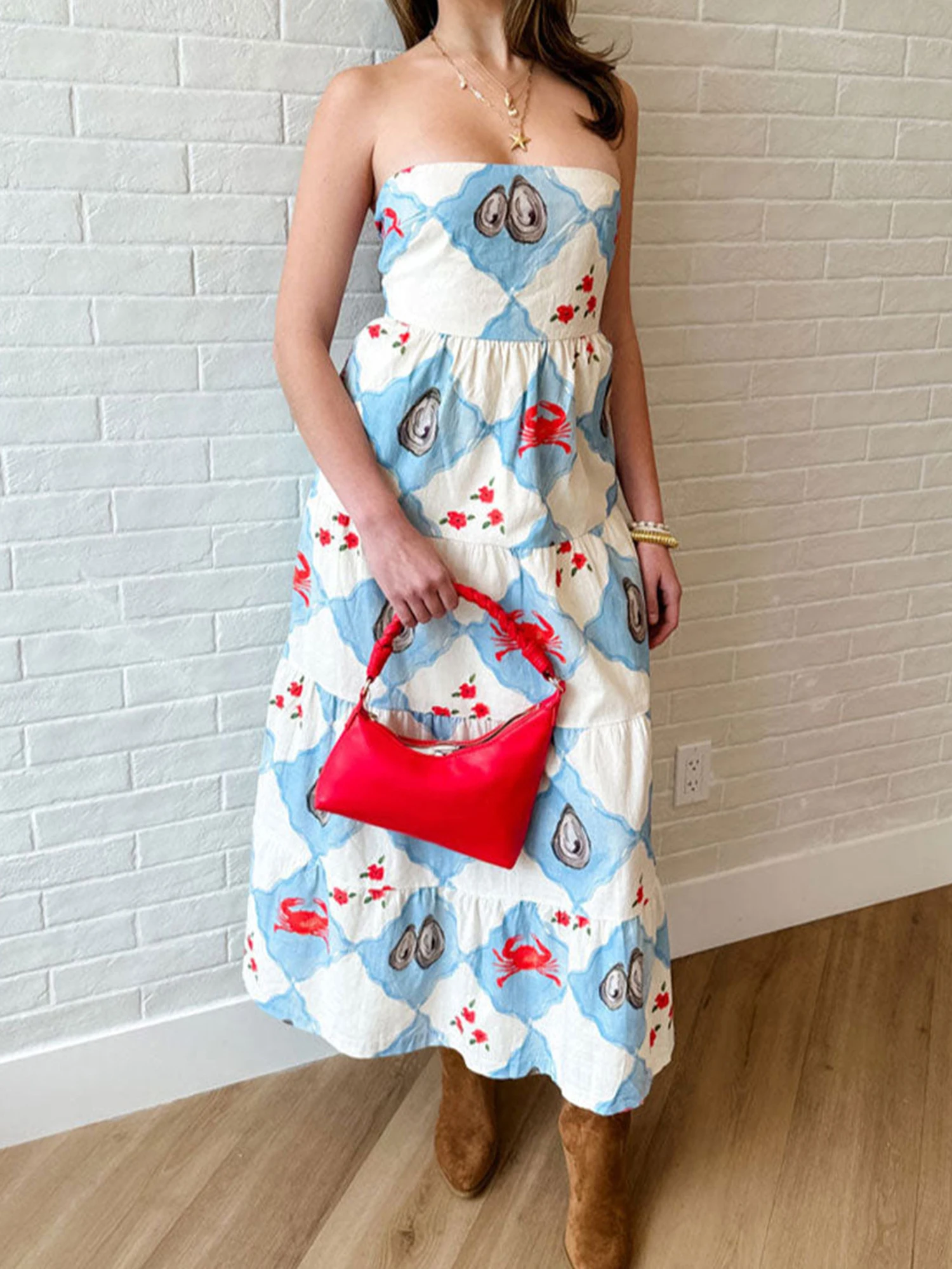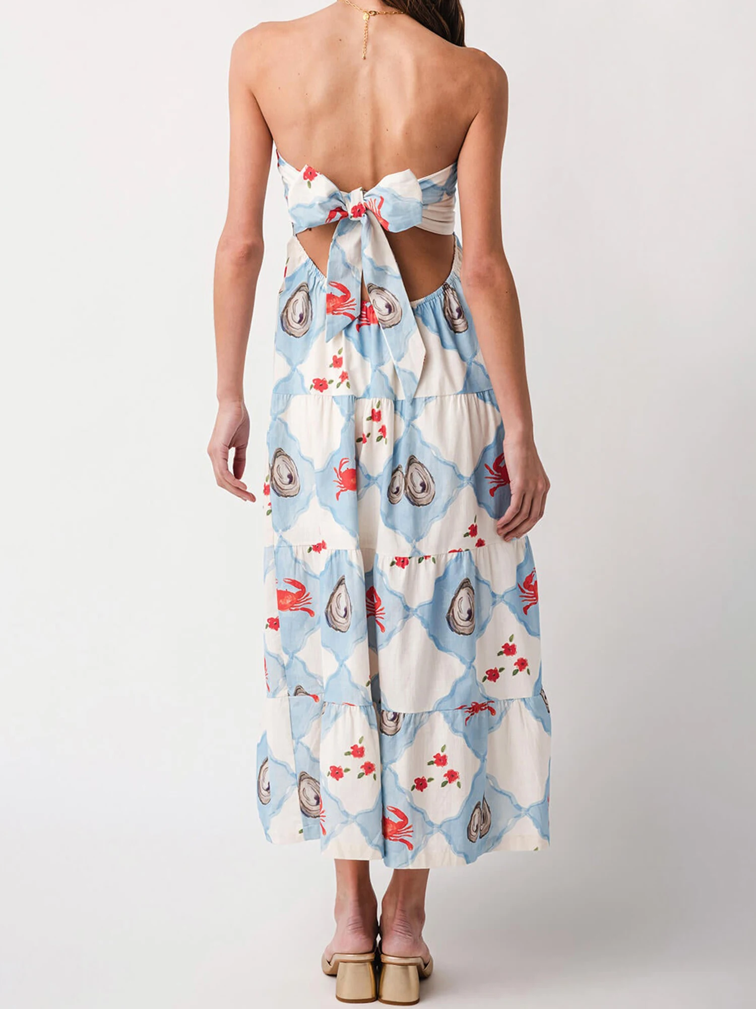 Women's Summer Tube Dress Floral Lobster Print Back Bowknot Strapless Flowy Long Dress