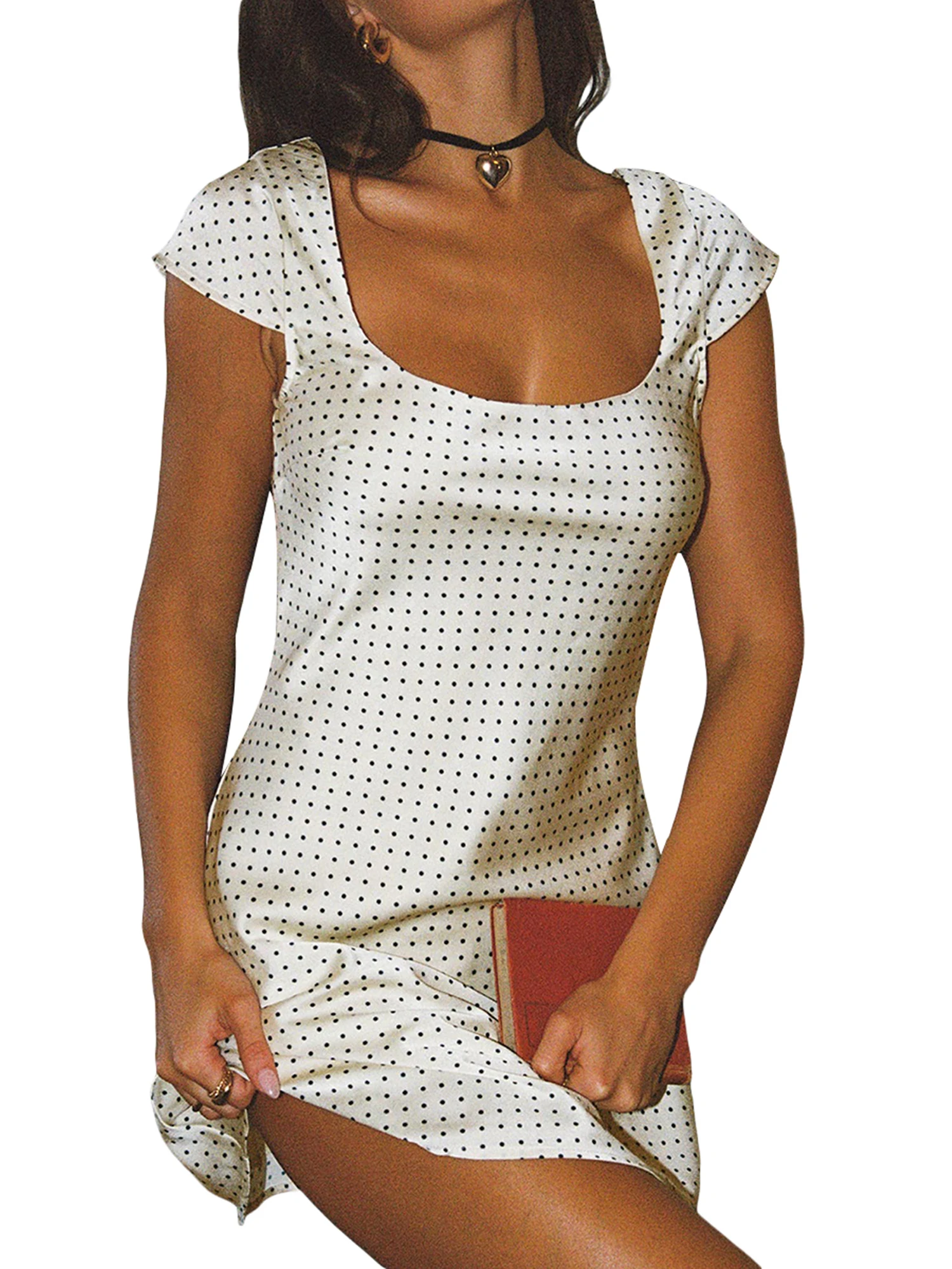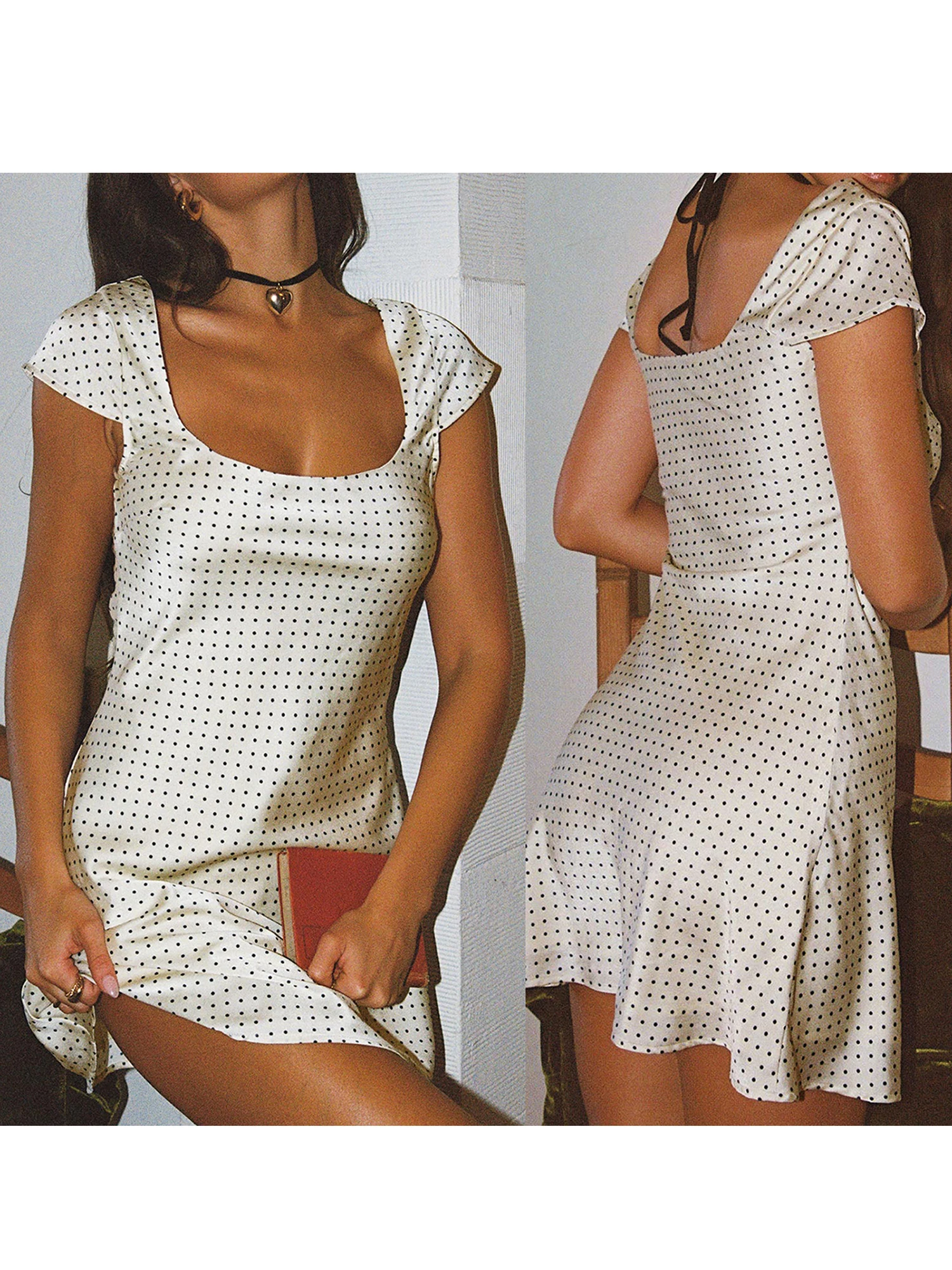 Women Mini Dress Elegant Short Sleeve U Neck Dots Print Summer Dress for Club Party