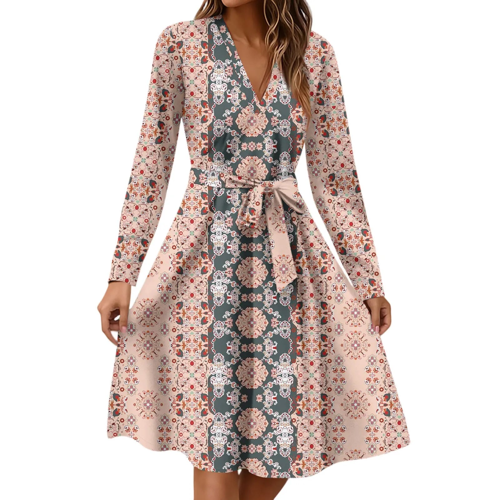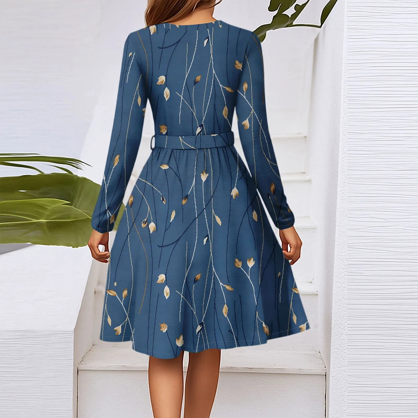 Women'S Fashion Casual V-Neck Long Sleeve Waist Floral Print Midi Dress Vestidos Para Mujer Female Dress Y2k Traf Roupas Feminin