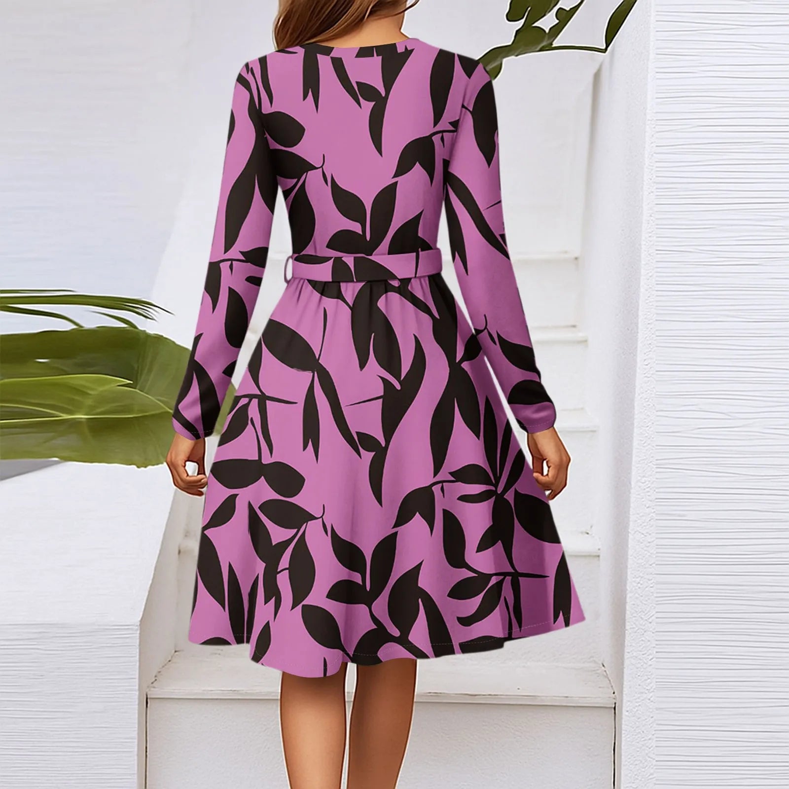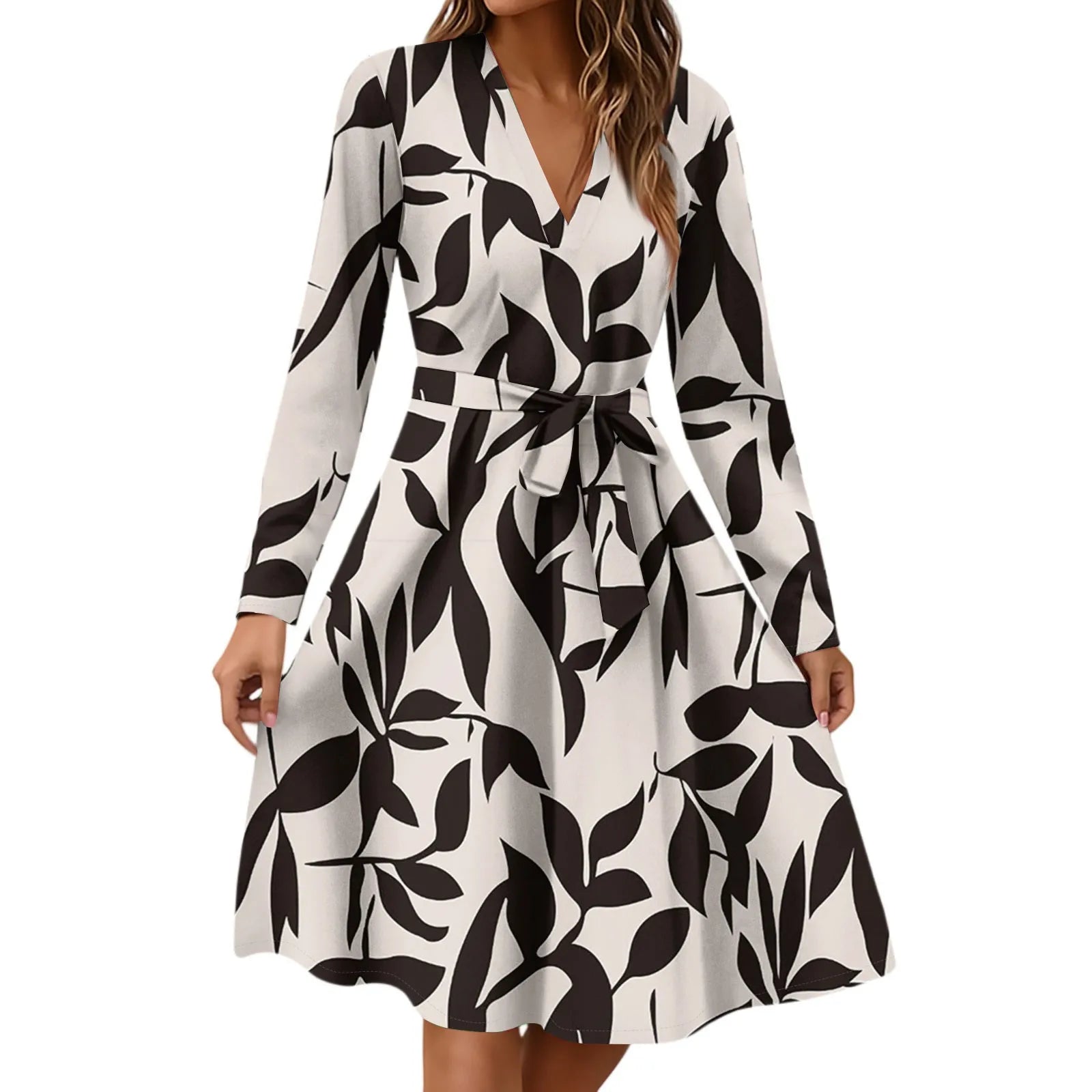 Women's Fashion Casual V-Neck Long Sleeve Waist Floral Print Midi Dress