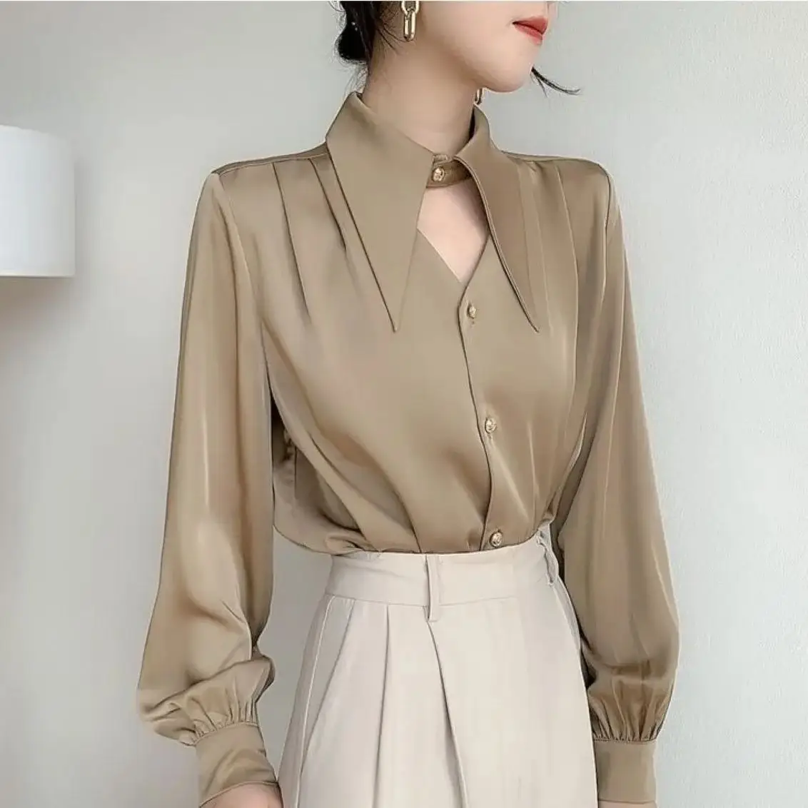 Women's Satin Shirt Spring Autumn Korean Temperament Long-sleeved Button-down Shirts Office Lady Work Wear Female Blouses Top